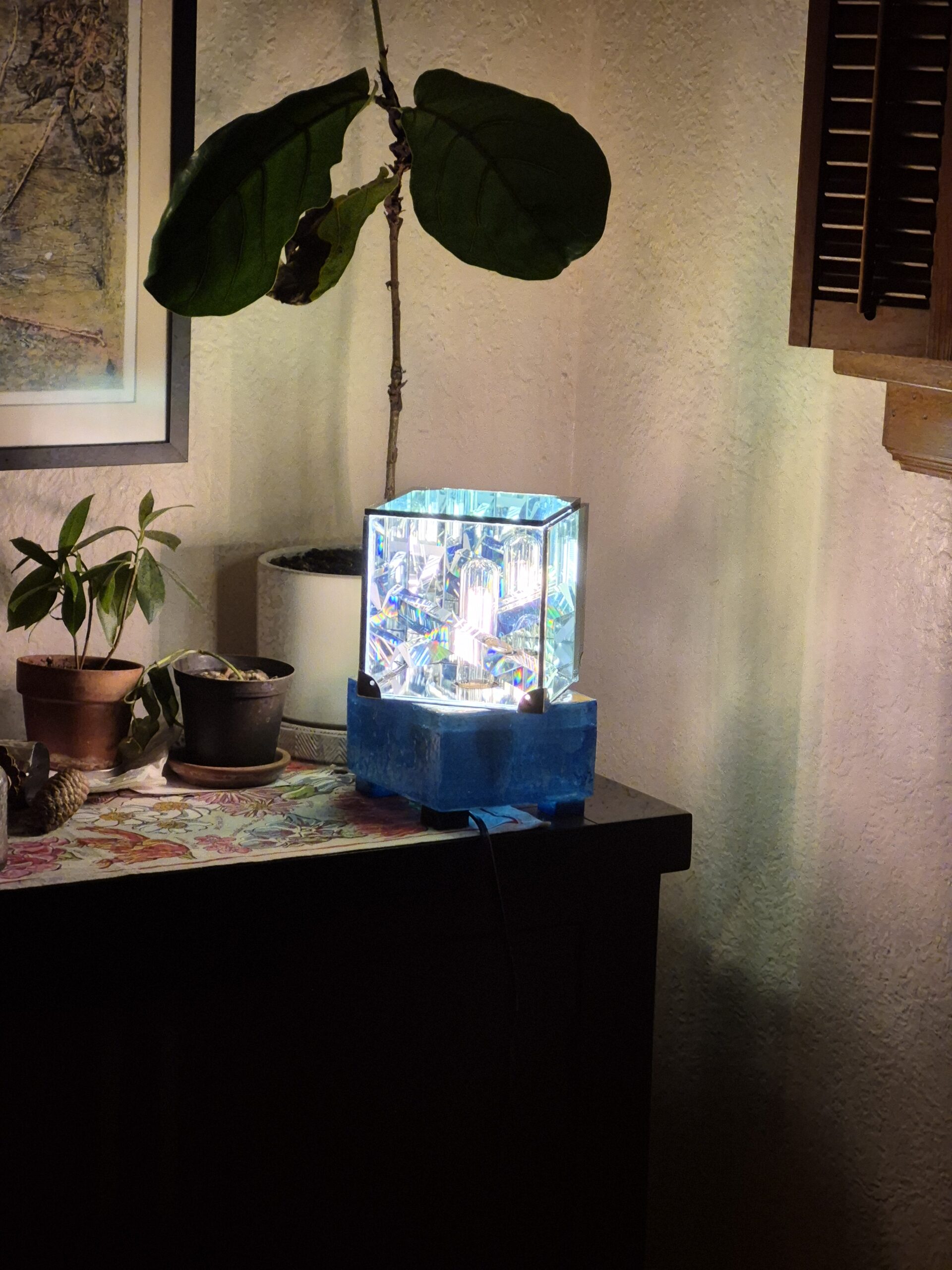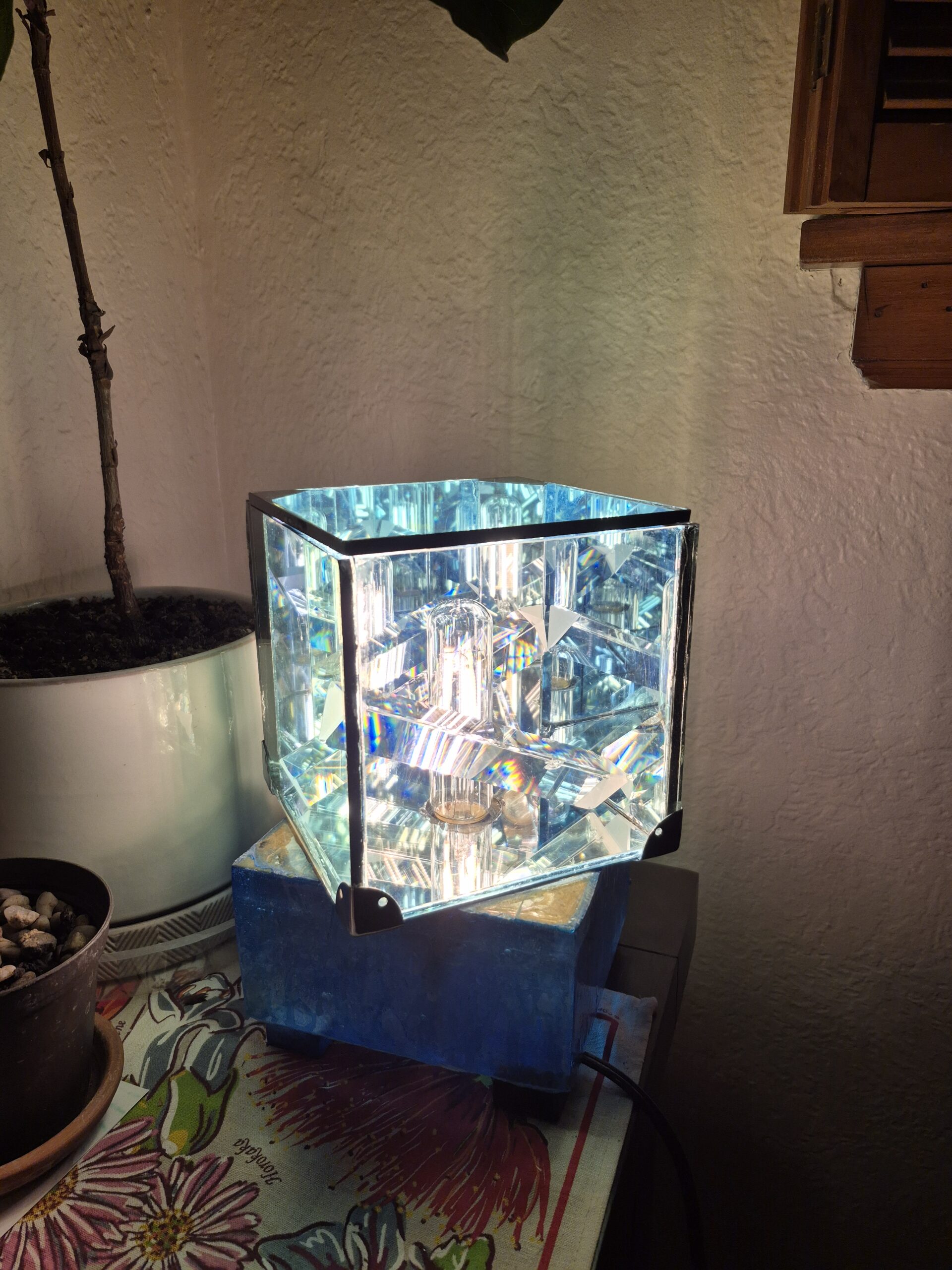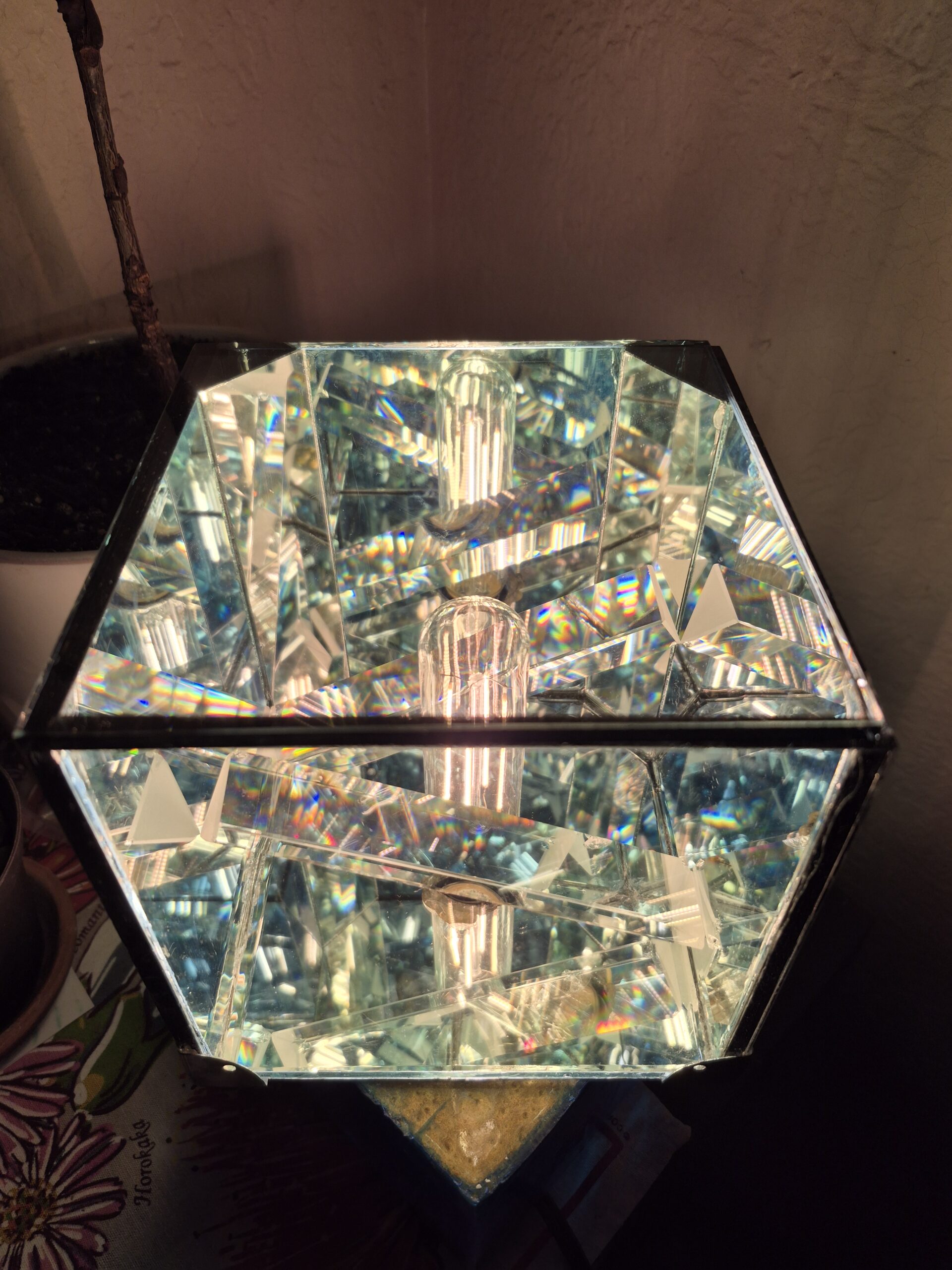 This very unique accent lamp is an infinity mirror inside of a 6 inch cube made from two-way mirrors. The cube sits on a resin base and it can be rotated by hand on a thrust bearing.  The light bulb is a warm LED which shines brightly through prisms into the reflective two-way mirrors but can be seen from the outside of the cube. Rainbows are created and can be seen as you change your perspective slowly looking at the lamp light.