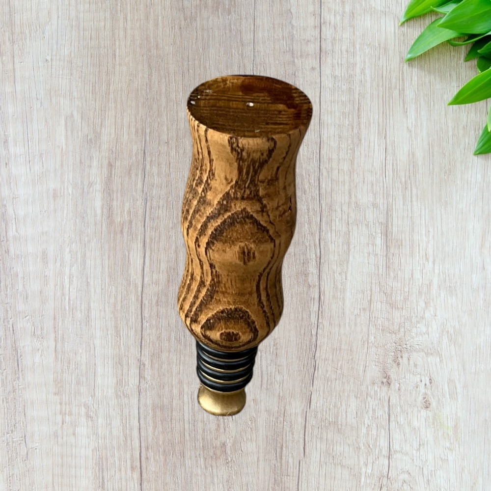 Handcrafted ash wood bottle stopper made in Mississippi with a brass base. A unique, functional wine accessory perfect for gifts, home bars, and rustic décor.