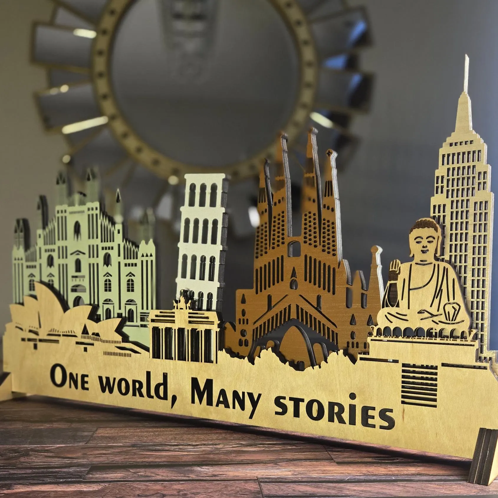 Sculptures 3D Laser Cut Wooden World Skyline Wall Art with LED Backlight