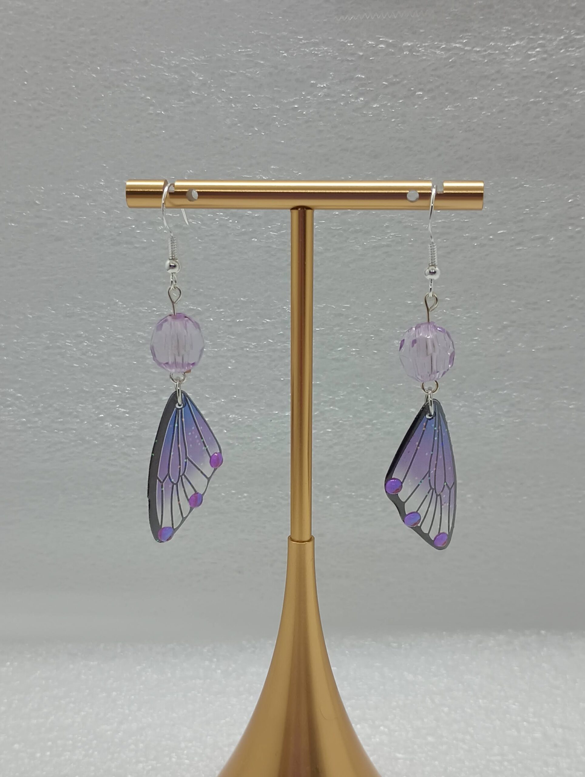 Add a touch of enchantment to your look with these dreamy lavender butterfly wing earrings! Featuring delicate purple gradient wings, each earring is topped with a faceted light lavender glass bead that catches the light beautifully. Lightweight and graceful, they sway softly with every movement—perfect for adding a magical finish to any outfit. Wires are silver plated. Note: Mannequin head is life size to show accurate size & drop of the earrings, there is a bright light so the colors are a little washed out.