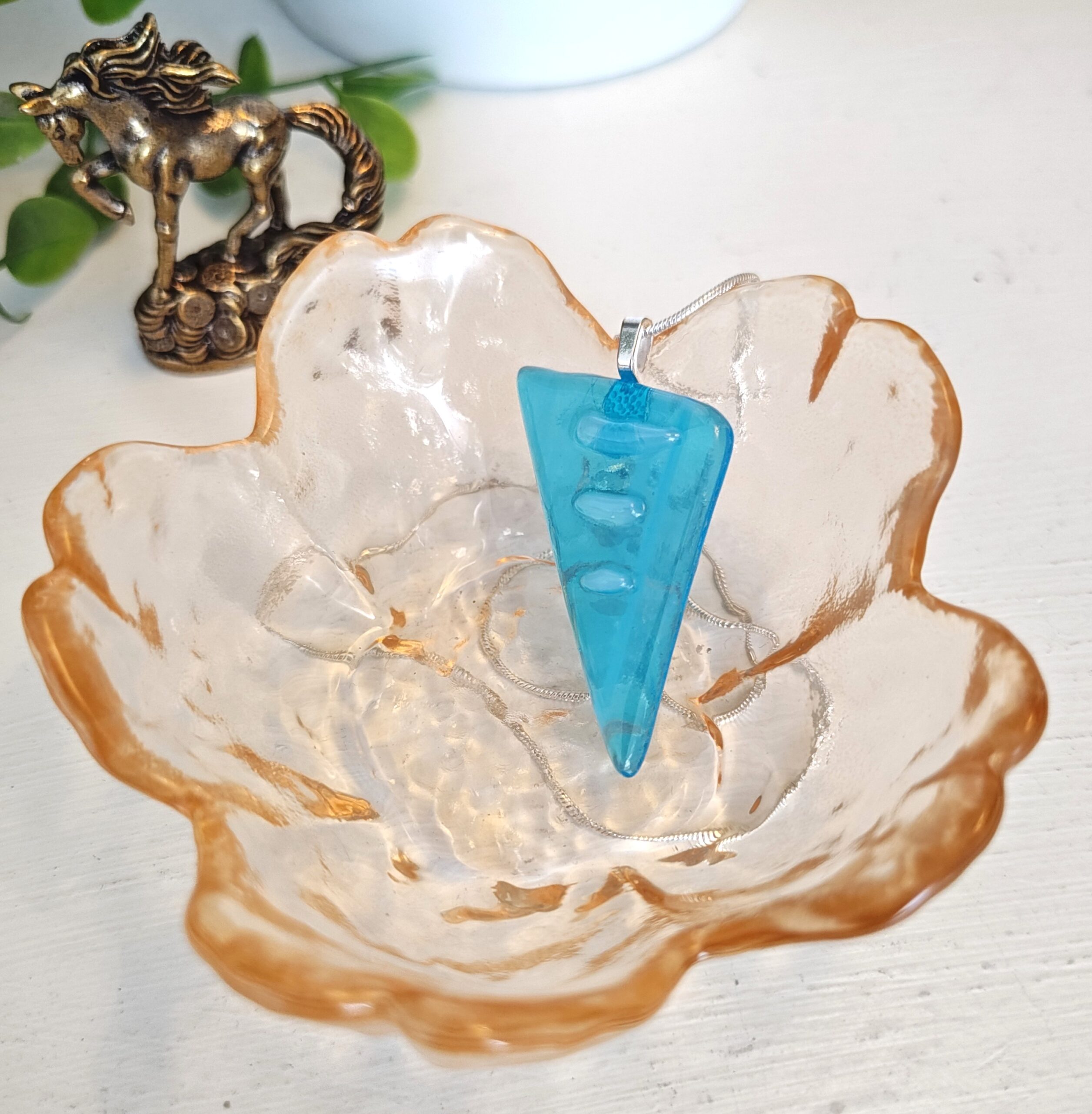 You receive this one of a kind handmade fused glass pendant and a silver colored snake chain.