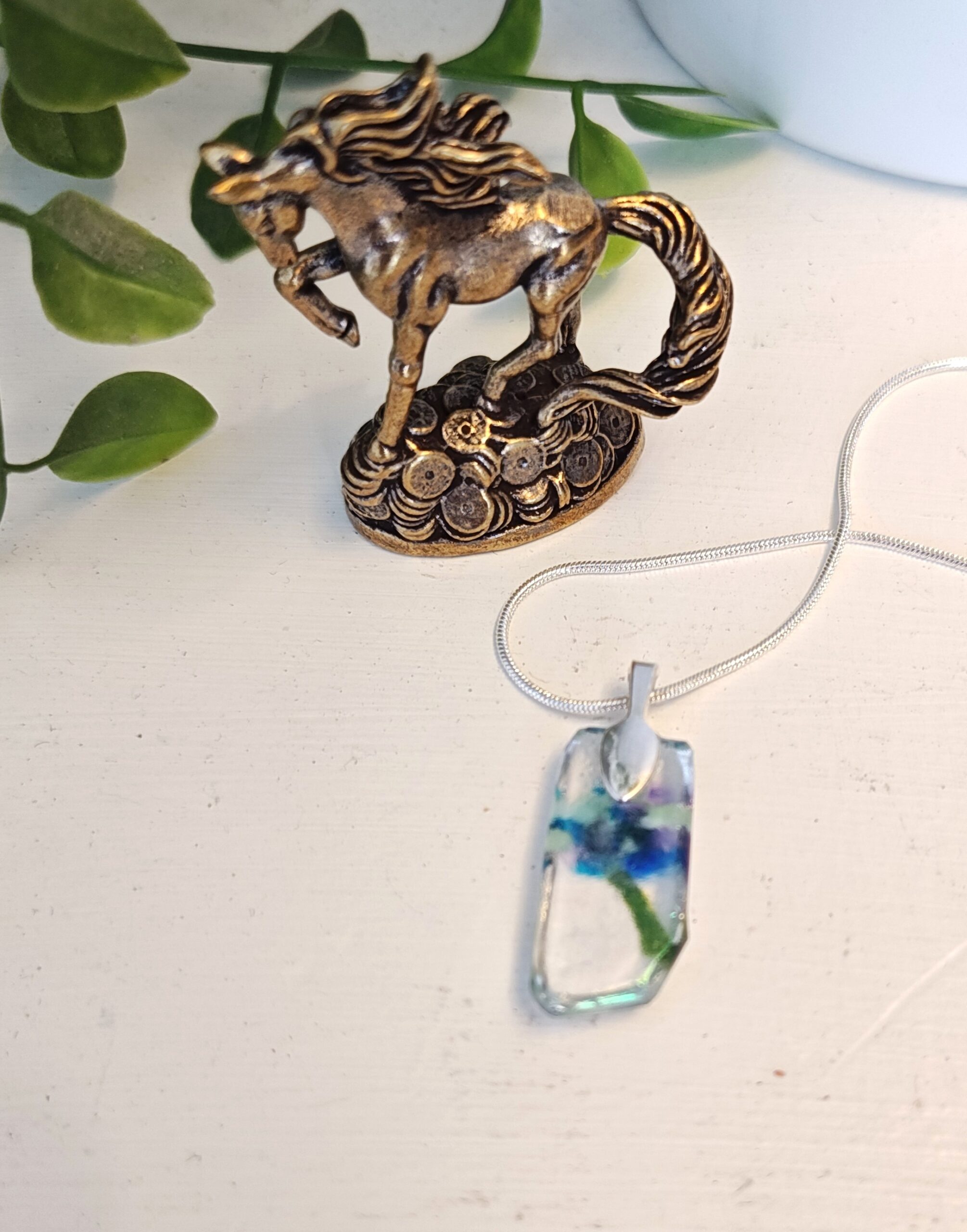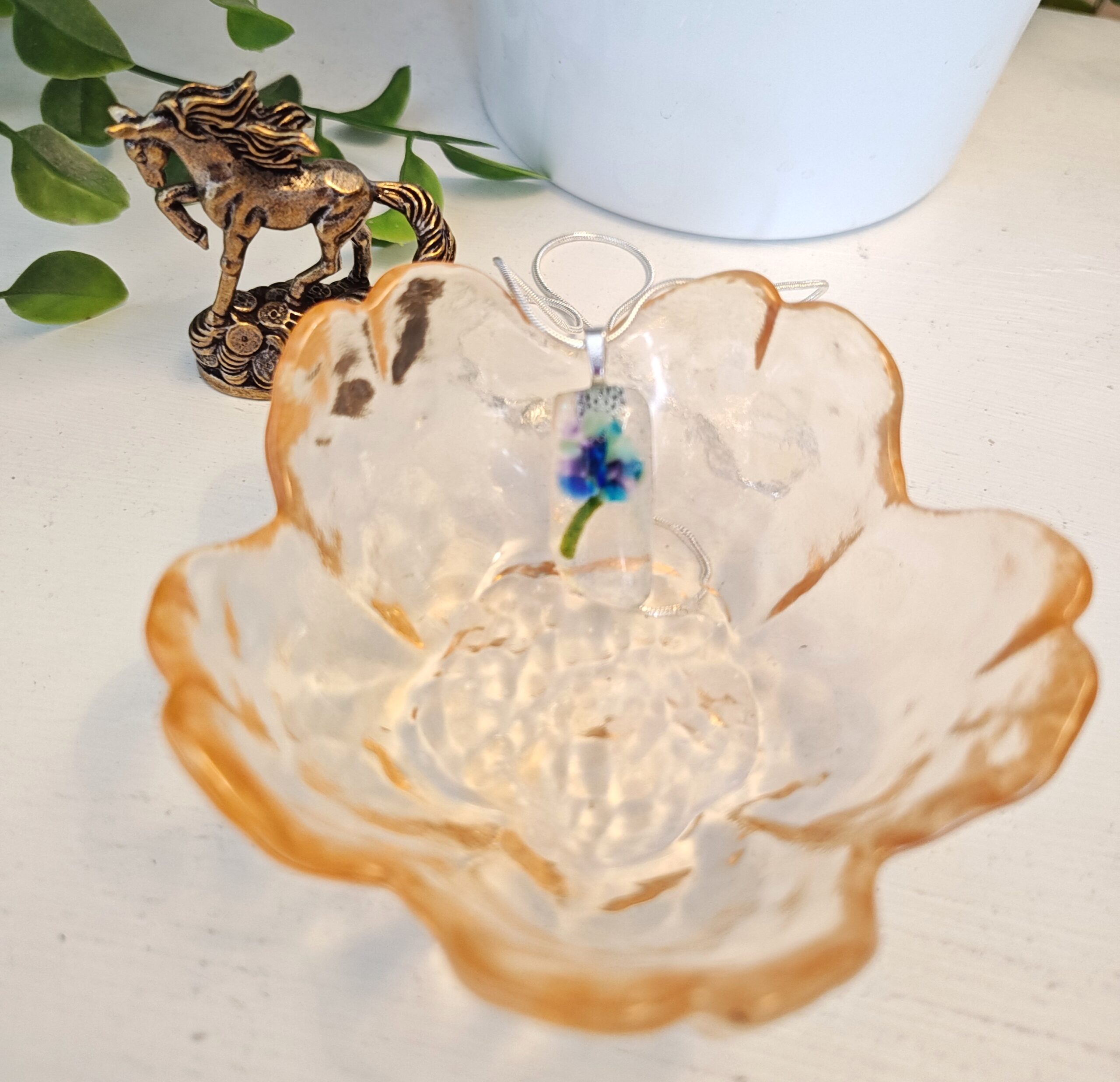 This one of a kind fused glass pendant is a tiny treasure, handcrafted with love and care. Each piece shimmers with its own unique blend of colors and textures, making every pendant truly special.