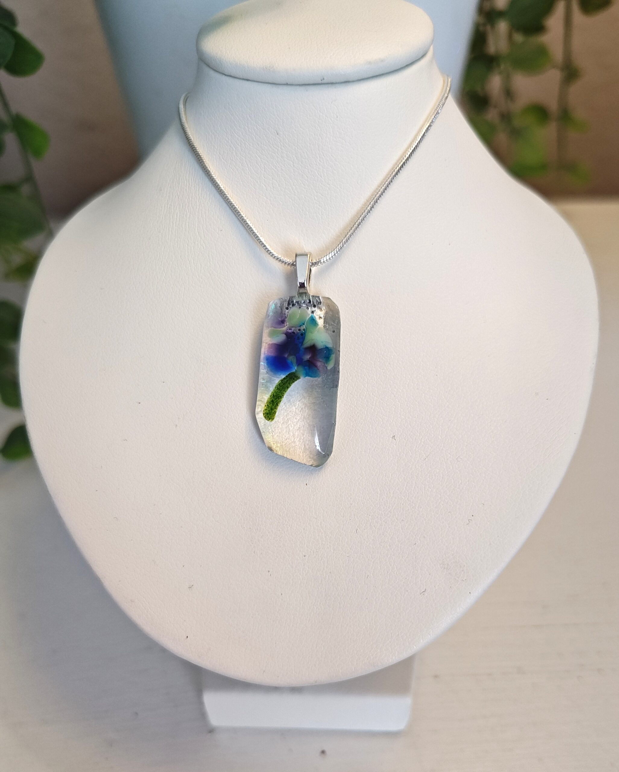 You receive this one of a kind handmade fused glass pendant and a silver colored snake chain.