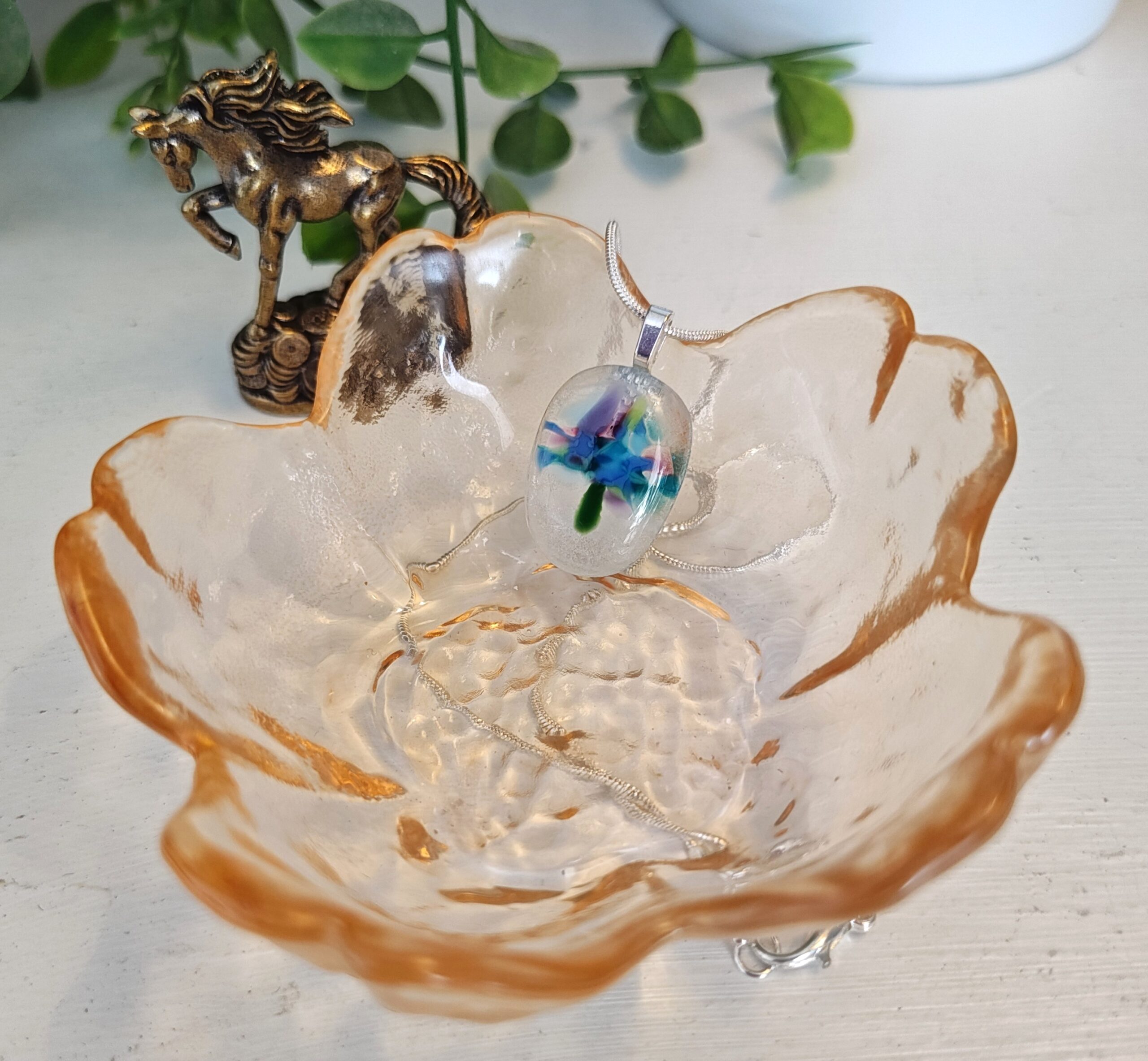 This one of a kind fused glass pendant is a tiny treasure, handcrafted with love and care. Each piece shimmers with its own unique blend of colors and textures, making every pendant truly special.