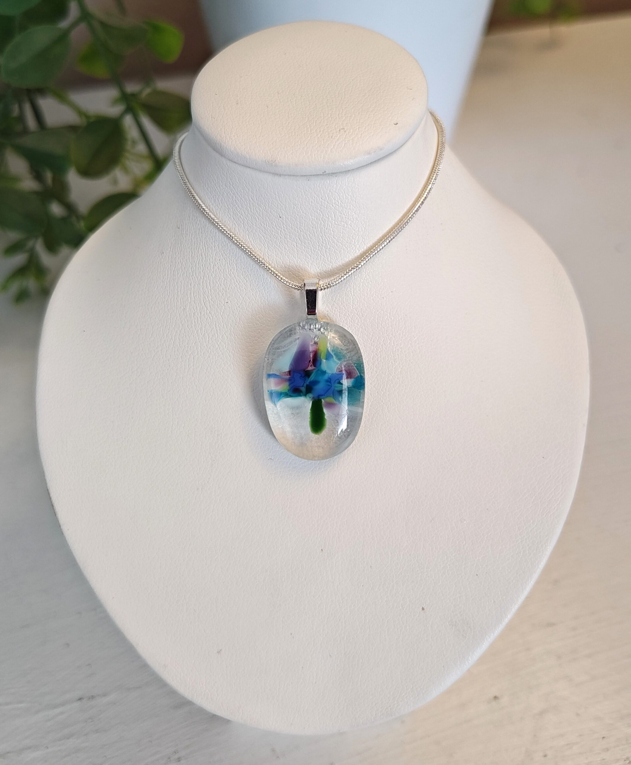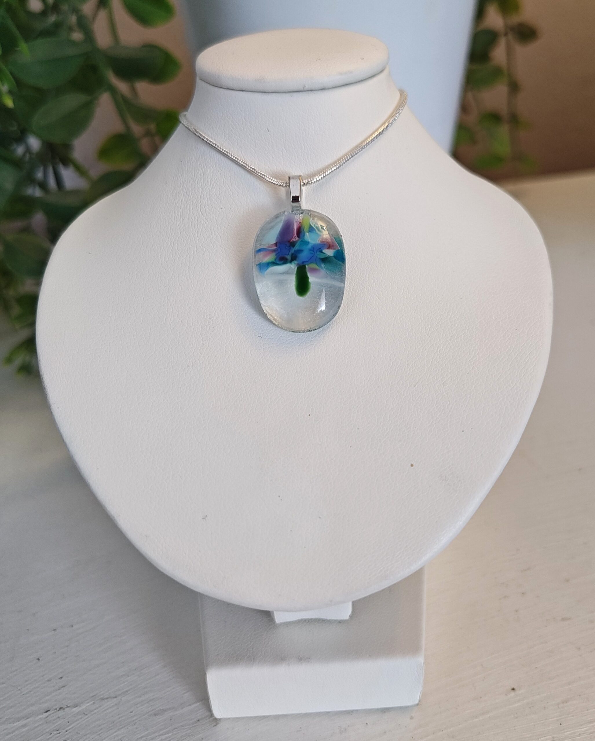 Clear with flowy blue, purple and white abstract flower pendant necklace, One of a kind artisan fused glass jewelry