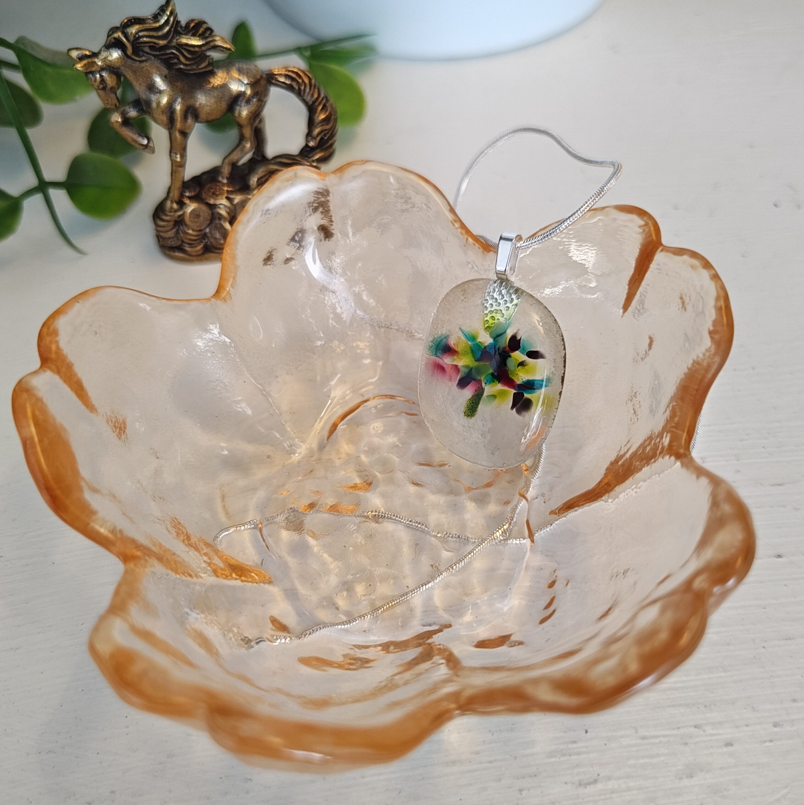 This one of a kind fused glass pendant is a tiny treasure, handcrafted with love and care. Each piece shimmers with its own unique blend of colors and textures, making every pendant truly special.