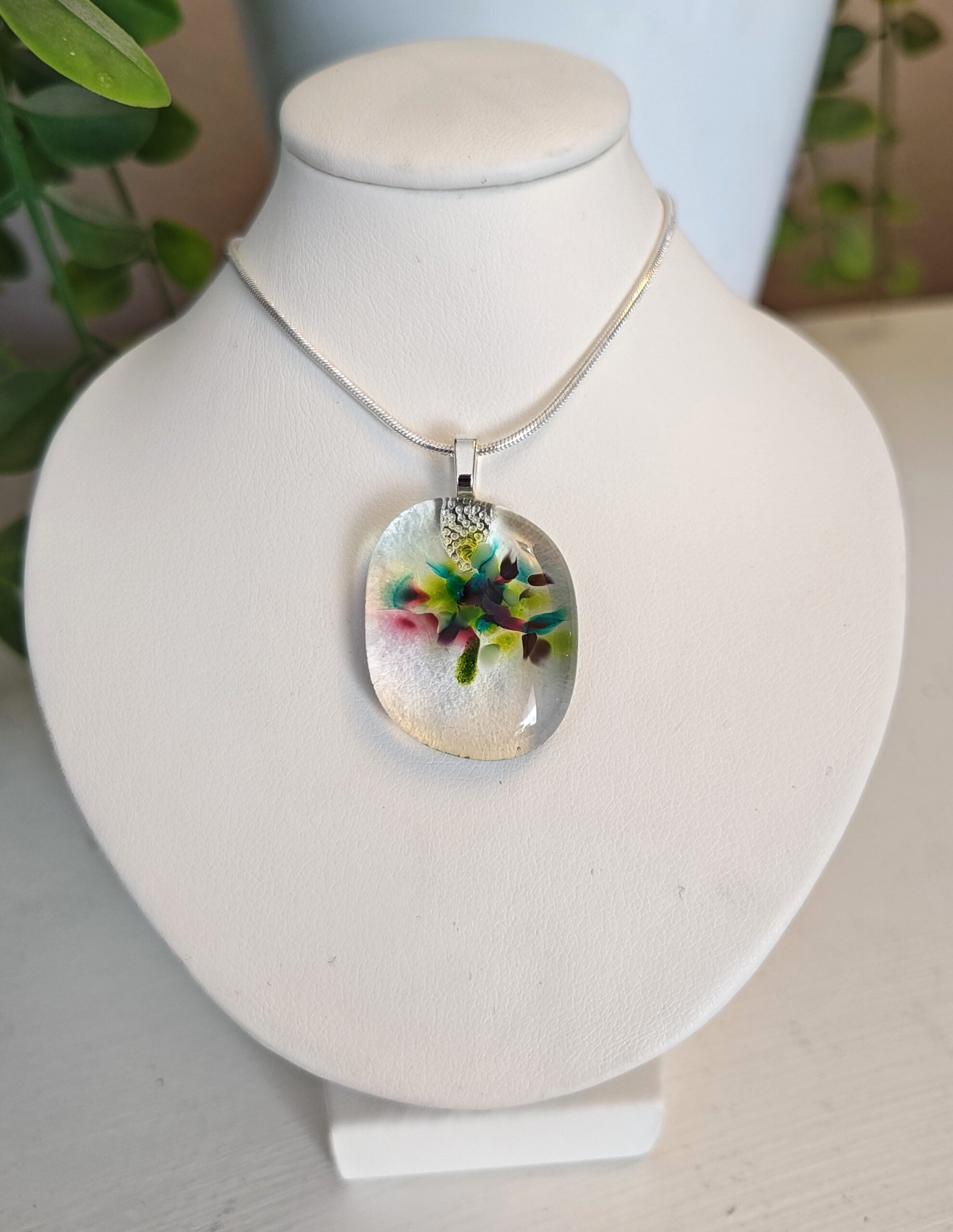 Colorful flowy abstract flower fused glass pendant necklace, One of a kind handmade artisan jewelry