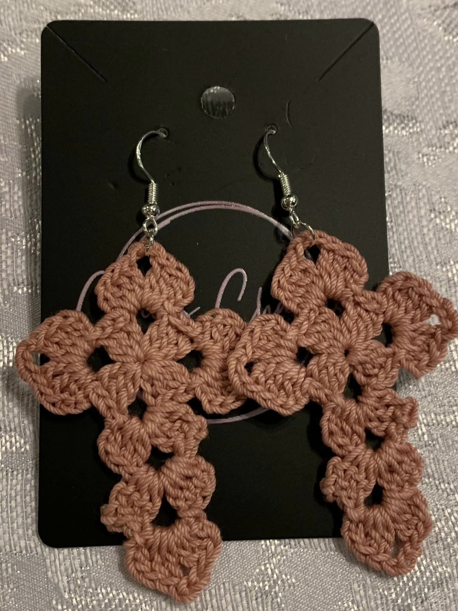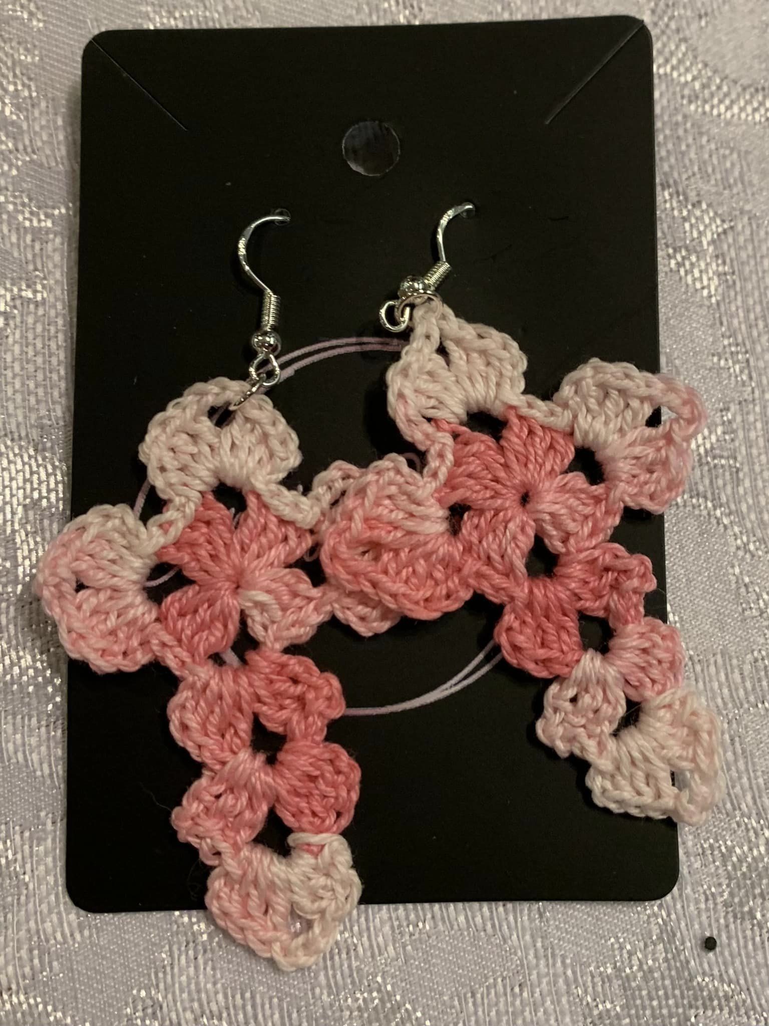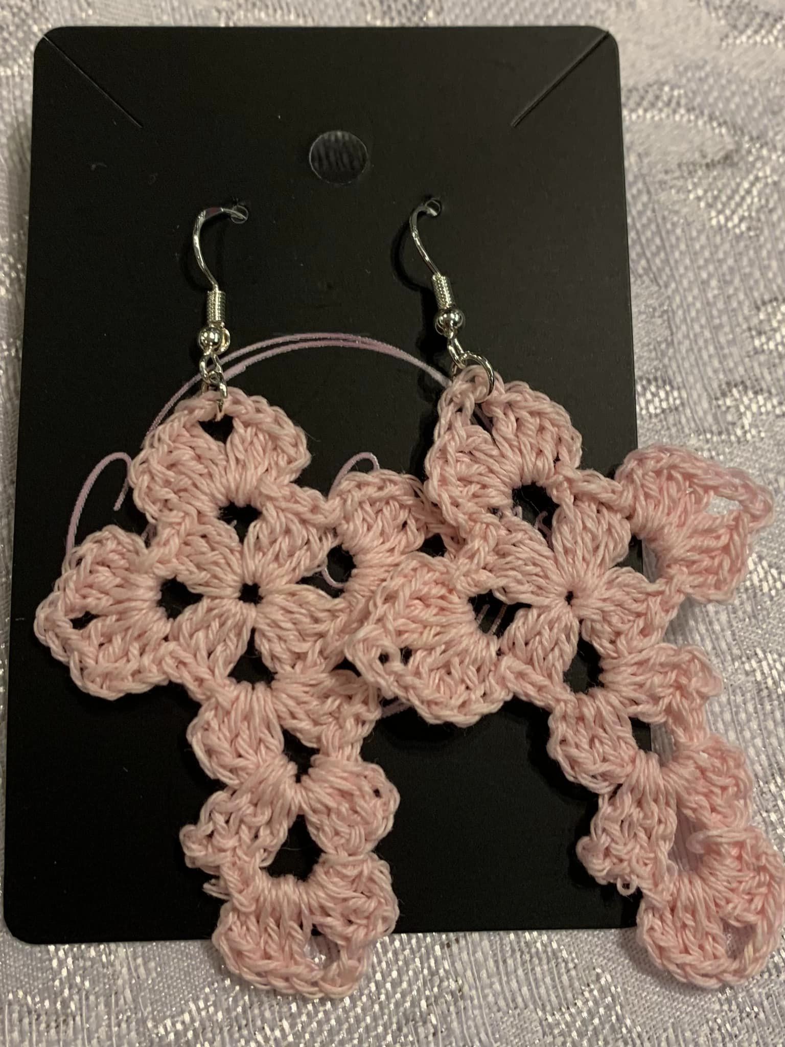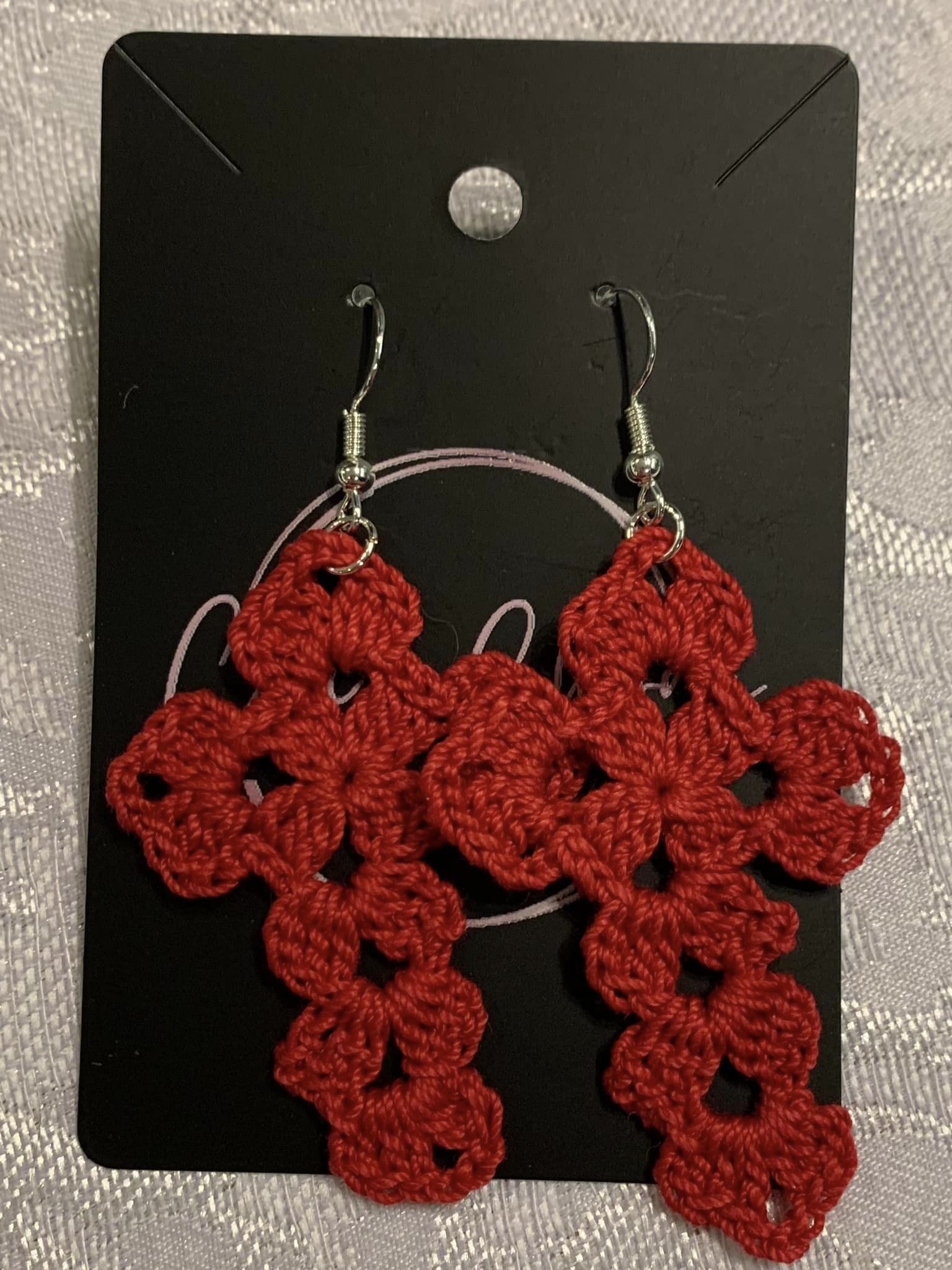 Crocheted with cotton thread. Hooks are sterling silver.