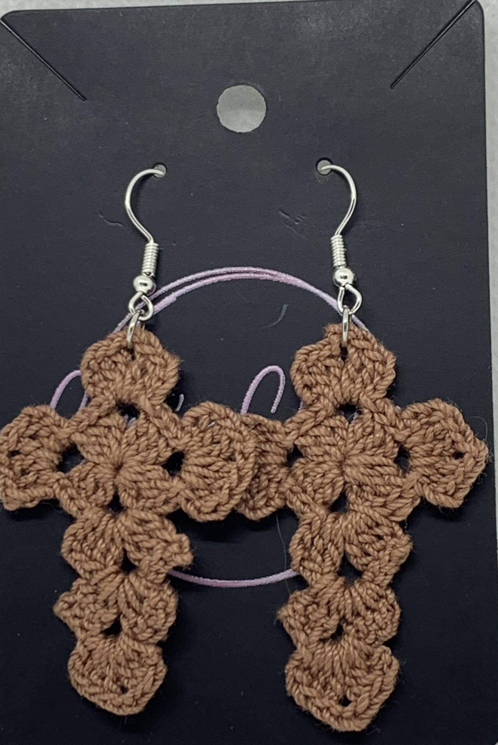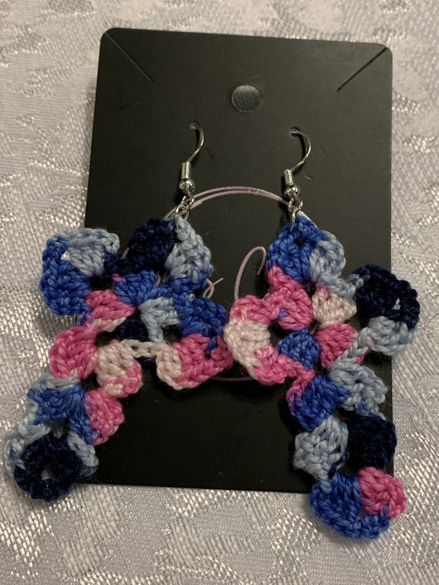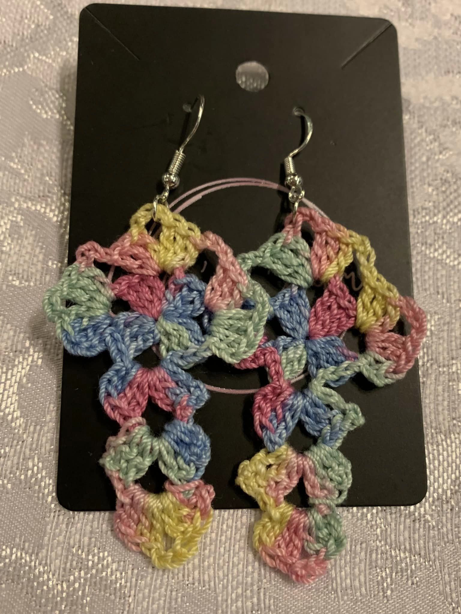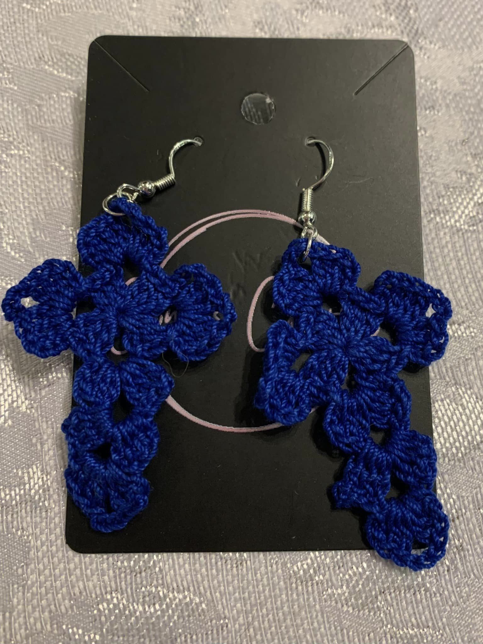 Crocheted with cotton thread. Hooks are sterling silver.