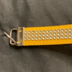 Handmade mustard yellow wristlet keychain featuring a full rhinestone strip for extra sparkle. Constructed with sturdy grosgrain ribbon and finished with a durable metal clasp and key ring.