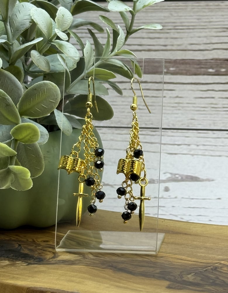 Add a bold, story‑steeped edge to your look with these gold sword‑and‑book dangle earrings. Faceted black glass beads catch the light between layers of gold‑tone chain, while the tiny book and dagger charms create a dramatic, fantasy‑inspired silhouette. Lightweight and eye‑catching, they’re perfect for readers, role‑players, and anyone who loves jewelry with a touch of myth and mischief.