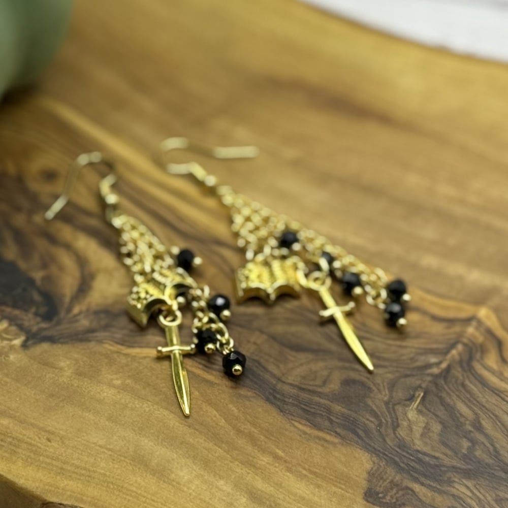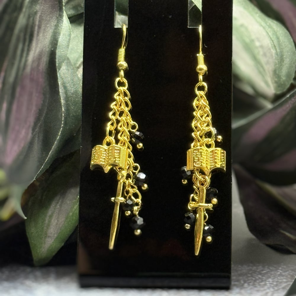Gold Sword & Book Earrings | Black Beaded Fantasy Dangle Earrings | Bookish Jewelry