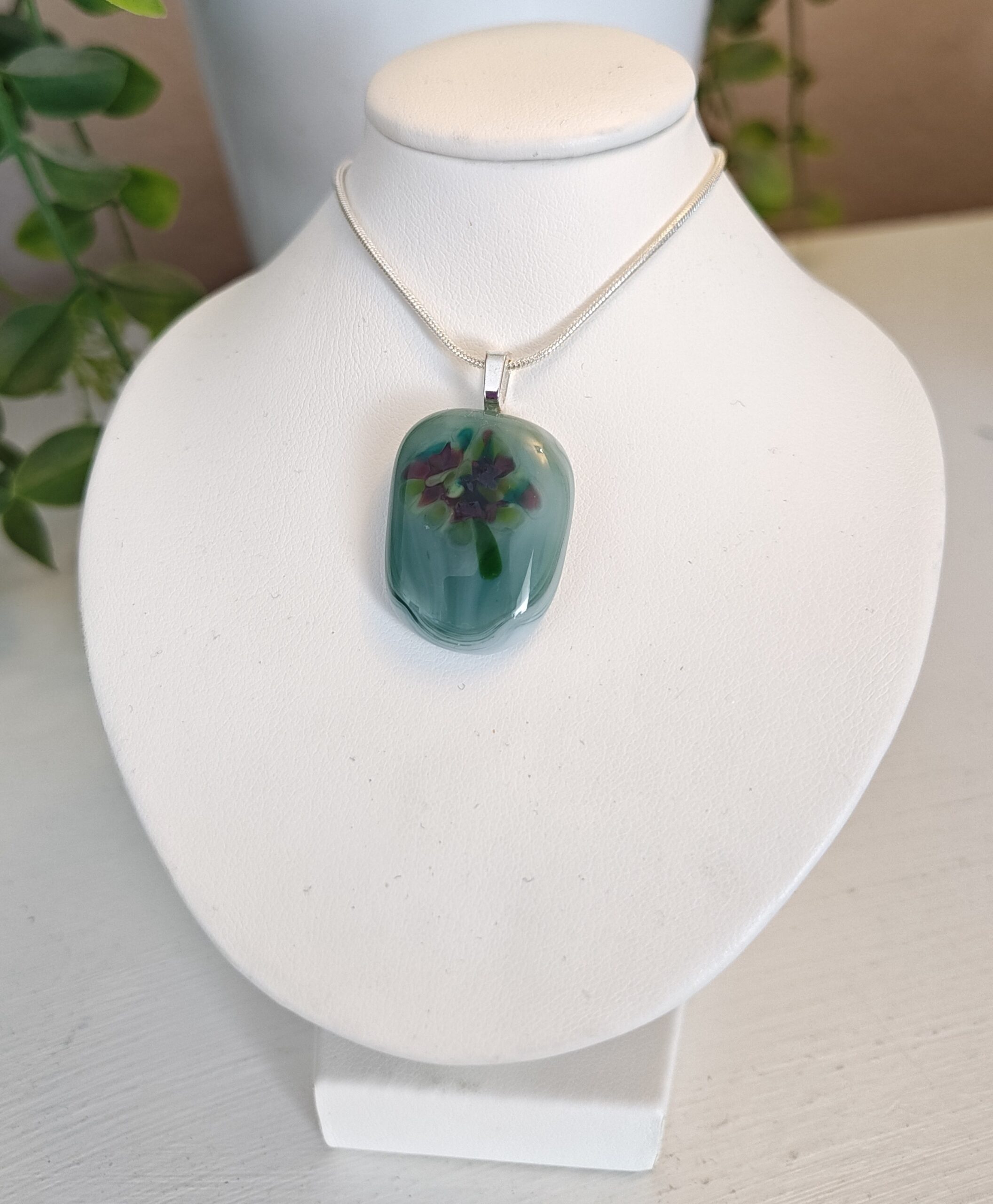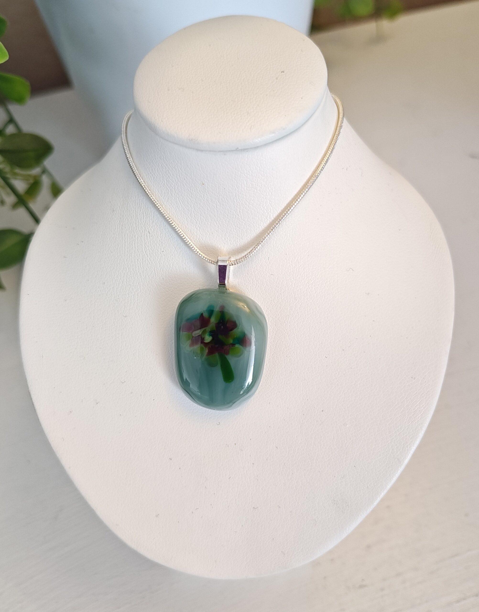 Green with burgundy & green flower pendant necklace, One of a kind fused glass jewelry