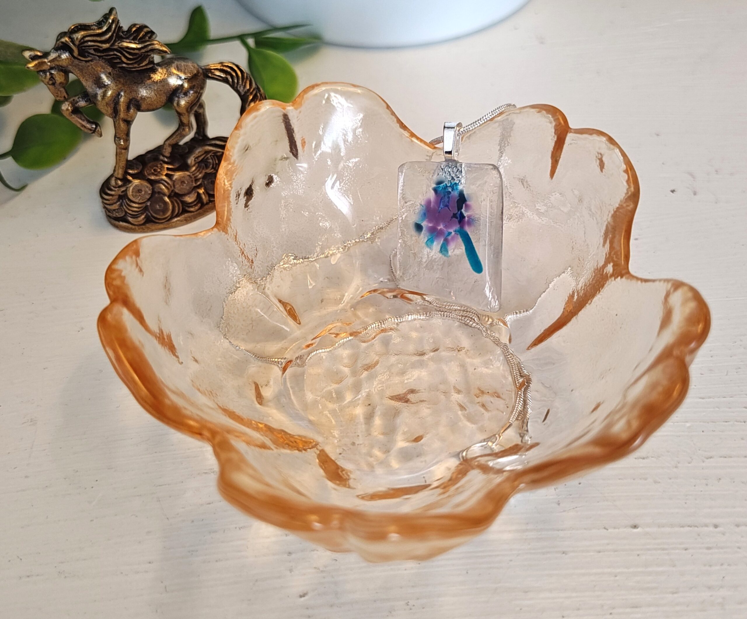 Fused glass has a luminous, dimensional quality that can be challenging to fully capture in photos. Please note that colors may appear slightly different depending on your screen settings.