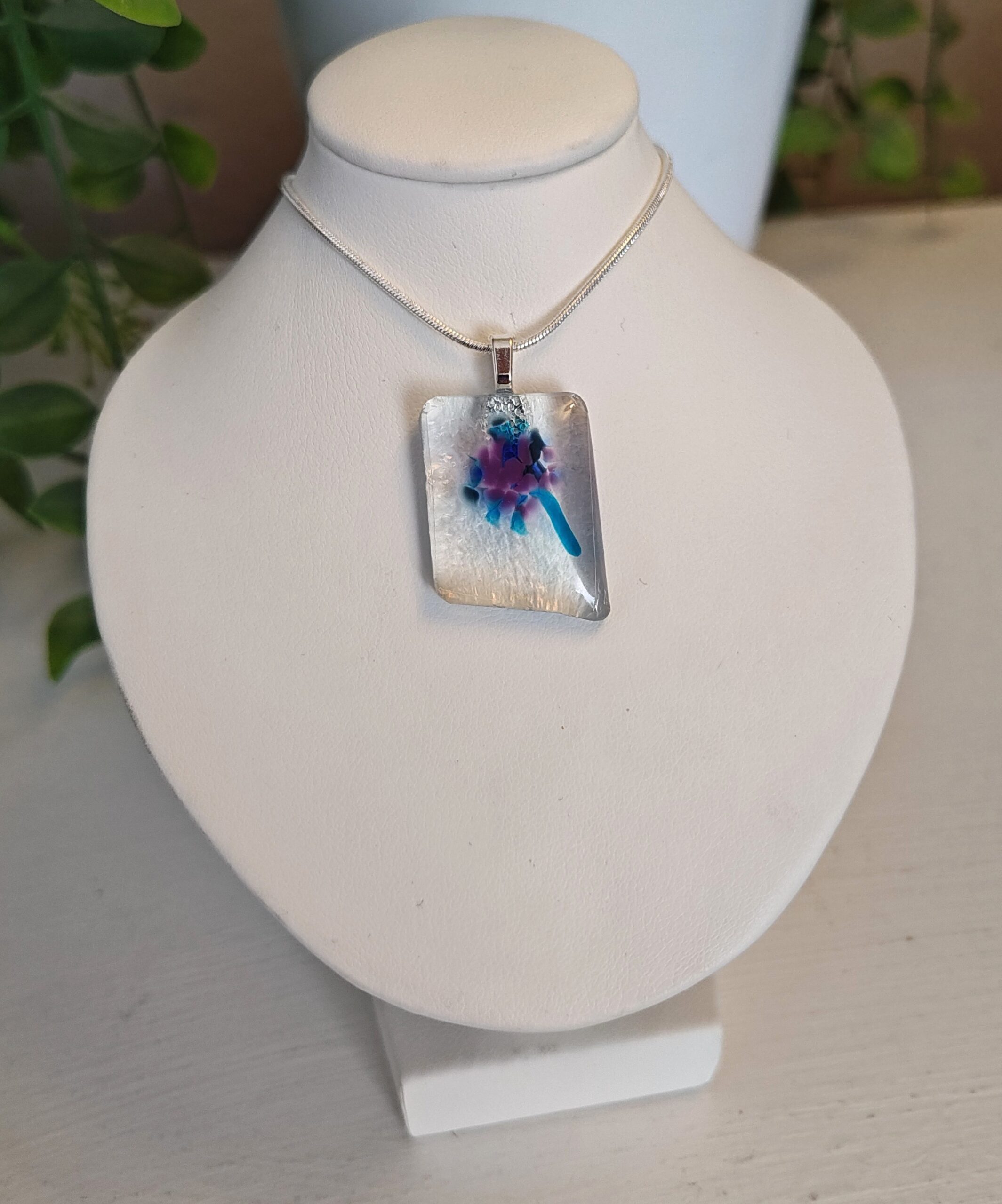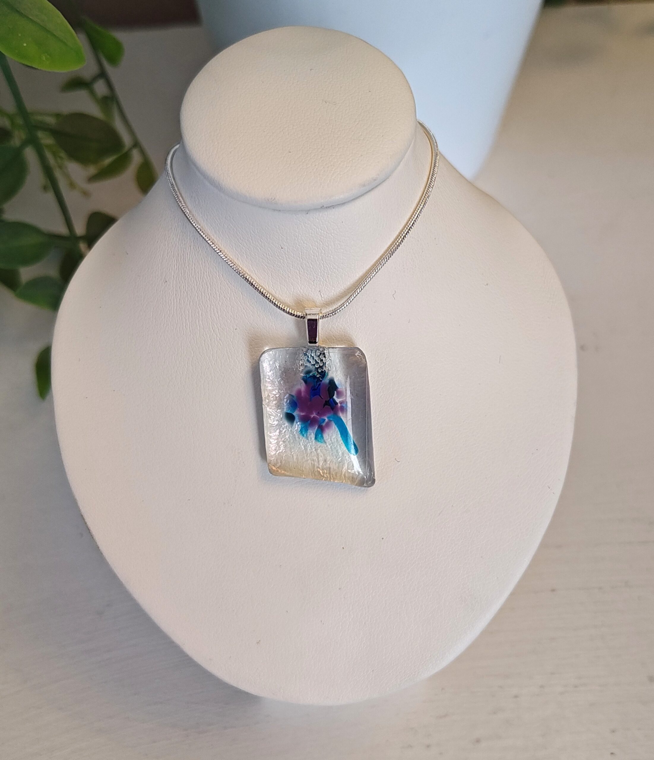 Iridescent clear blue & purple pendant necklace, handmade one of a kind fused glass jewelry
