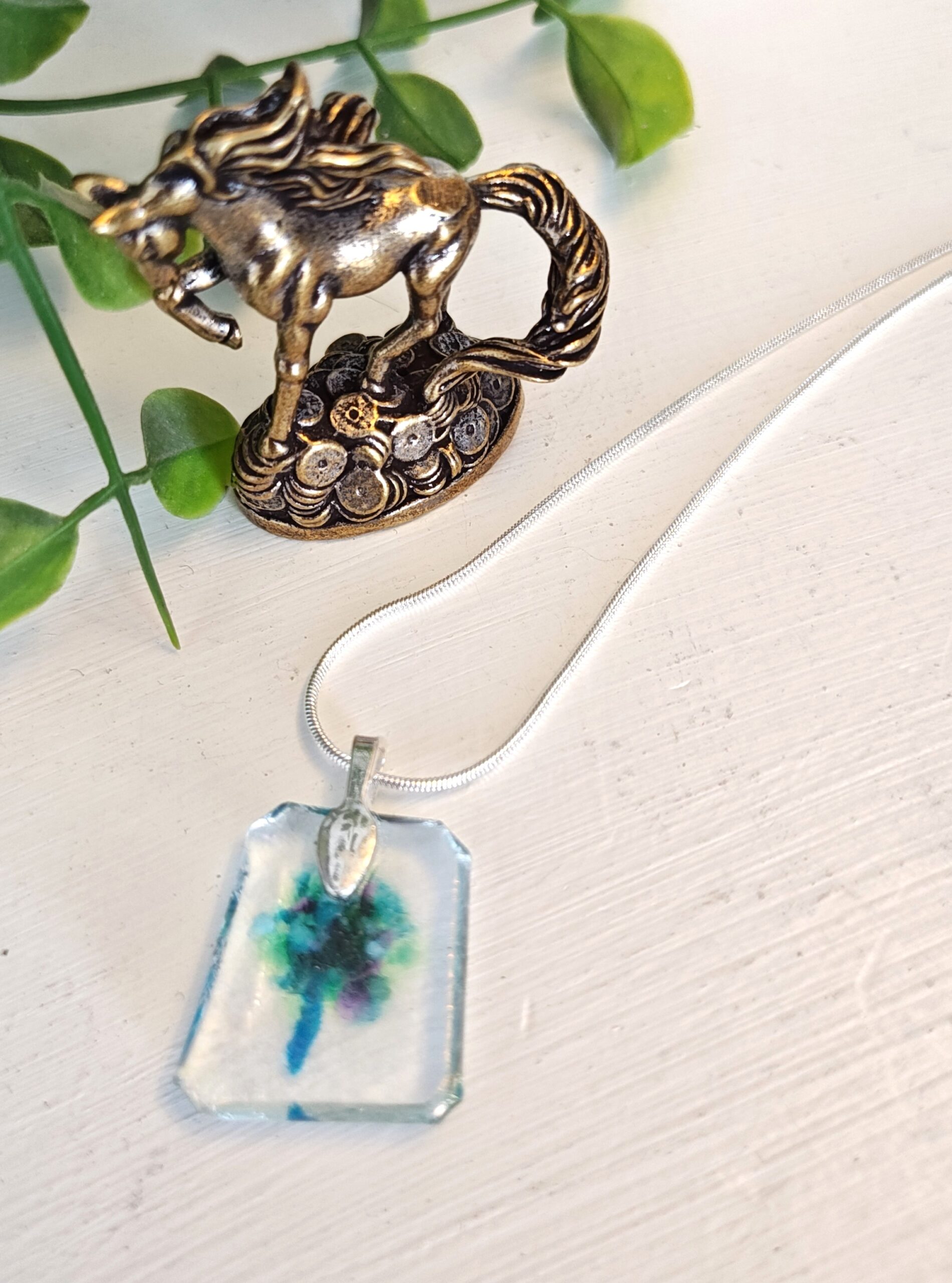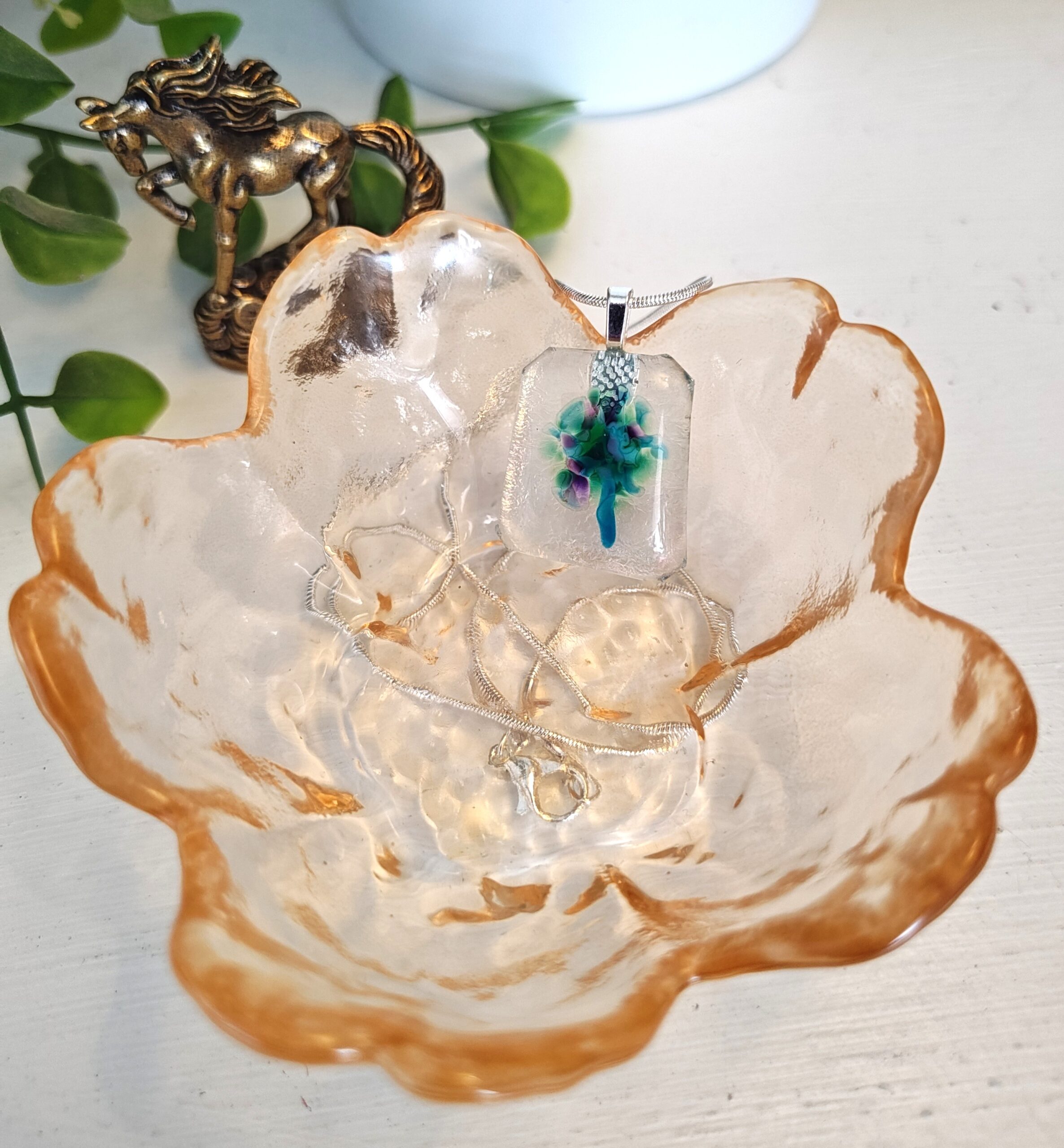 This one of a kind fused glass pendant is a tiny treasure, handcrafted with love and care. Each piece shimmers with its own unique blend of colors and textures, making every pendant truly special.
