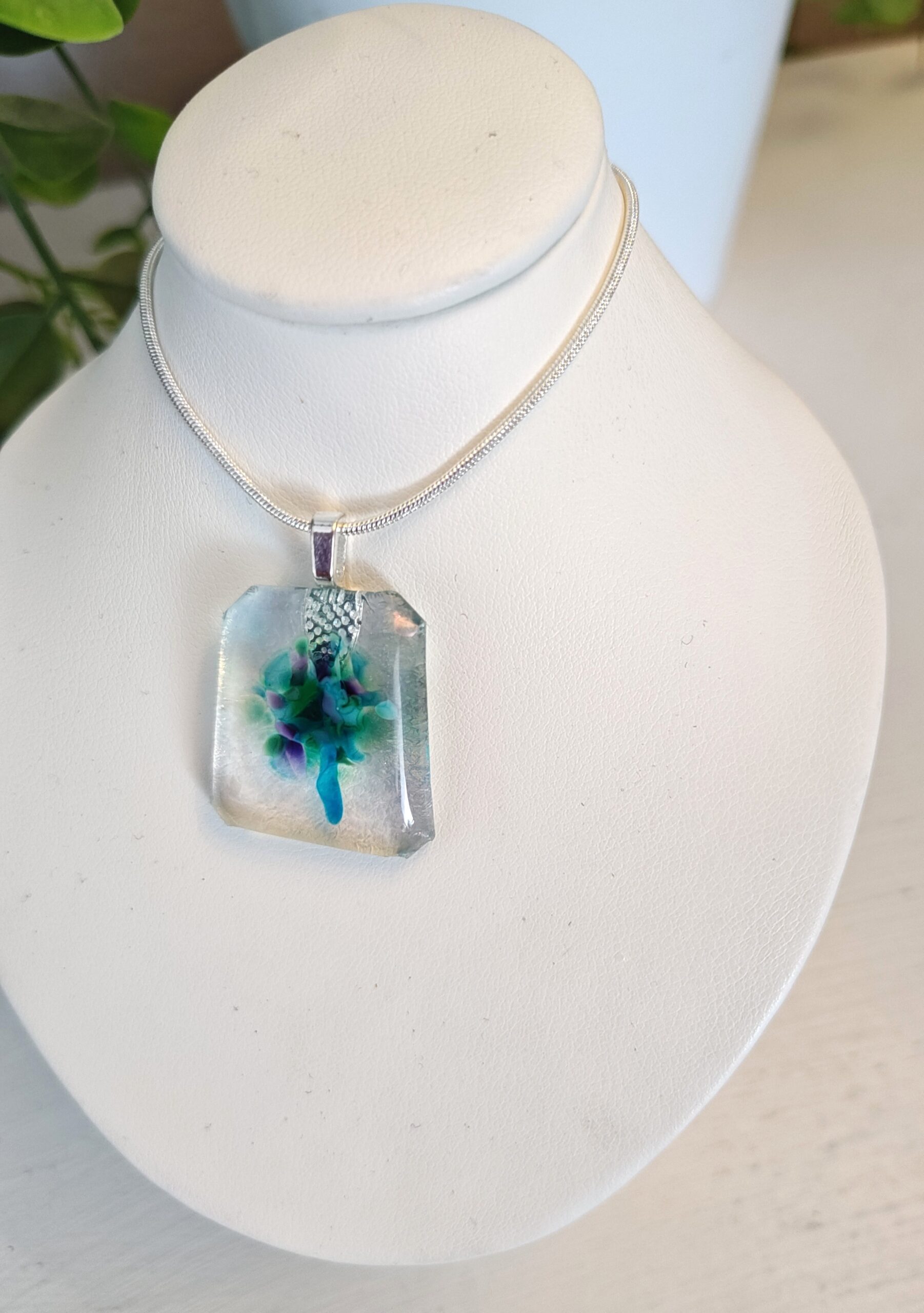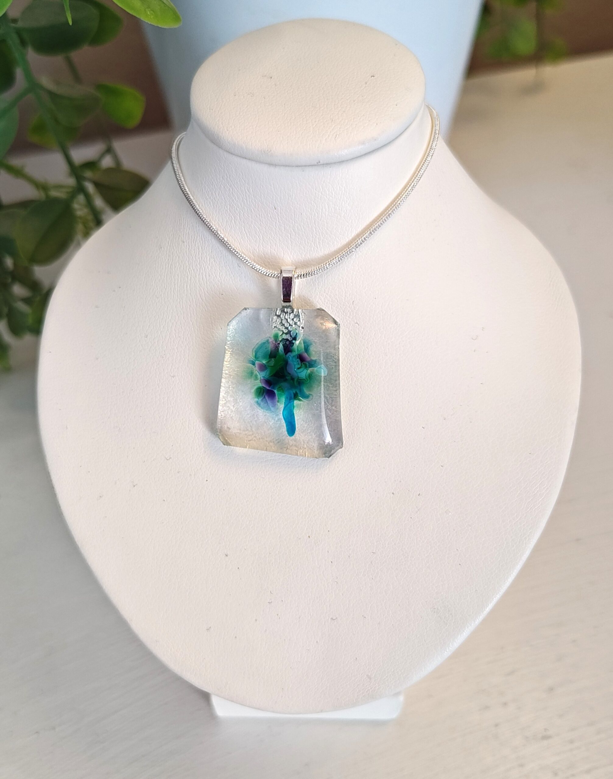 Iridescent Fused Glass Green and Blue Abstract Flower Pendant Necklace, Asymmetrical One of a Kind Artisan Jewelry