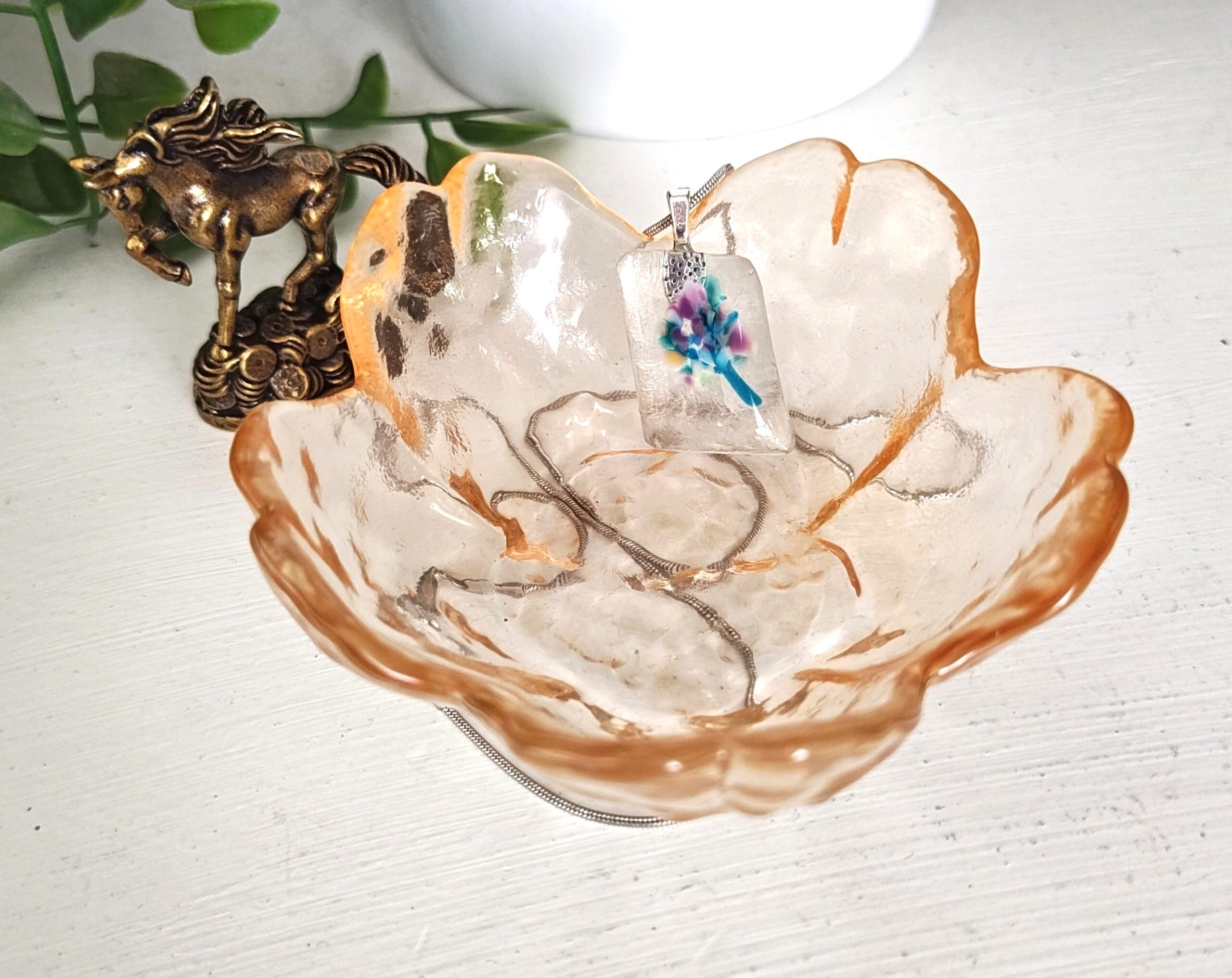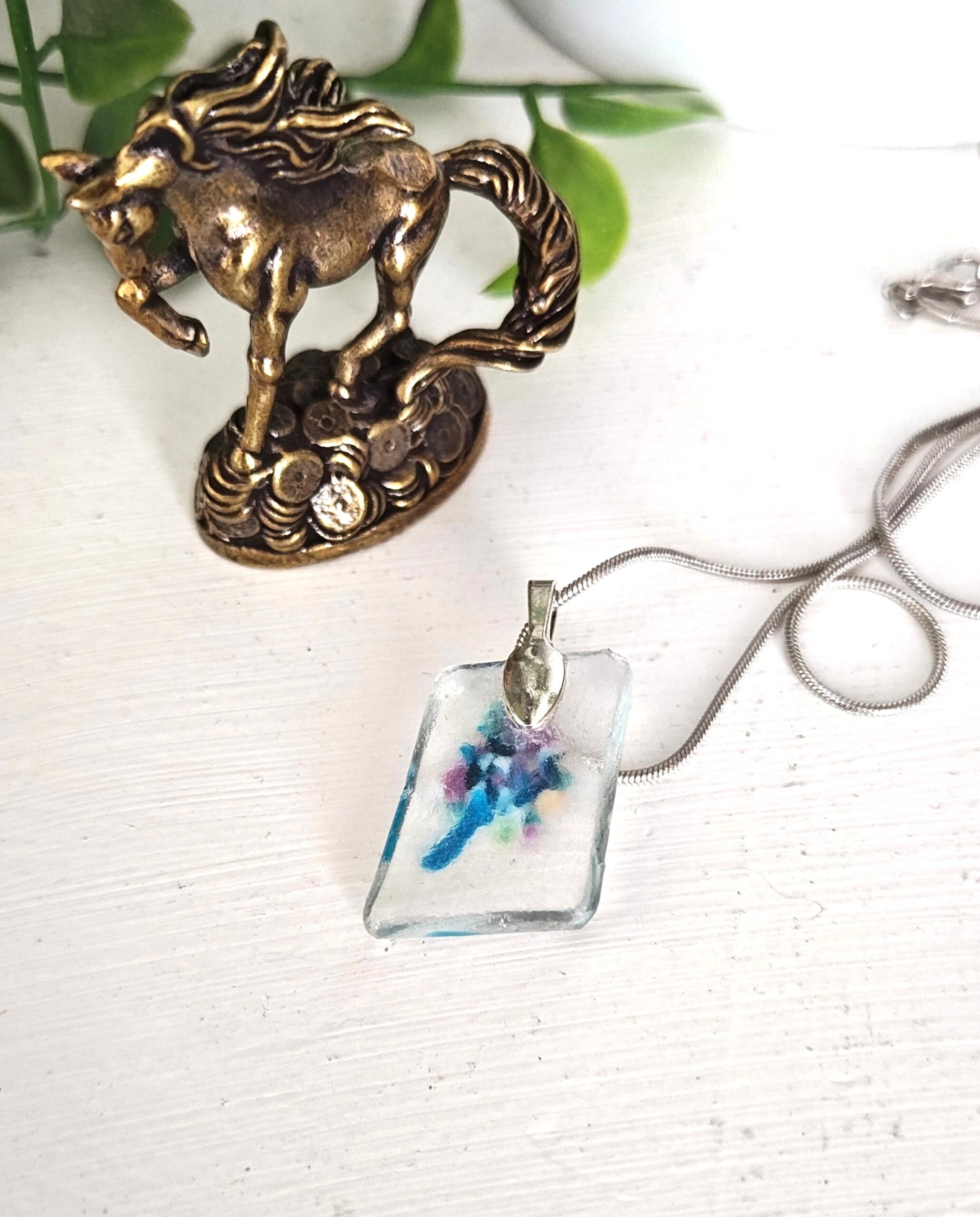 This one of a kind fused glass pendant is a tiny treasure, handcrafted with love and care. Each piece shimmers with its own unique blend of colors and textures, making every pendant truly special.