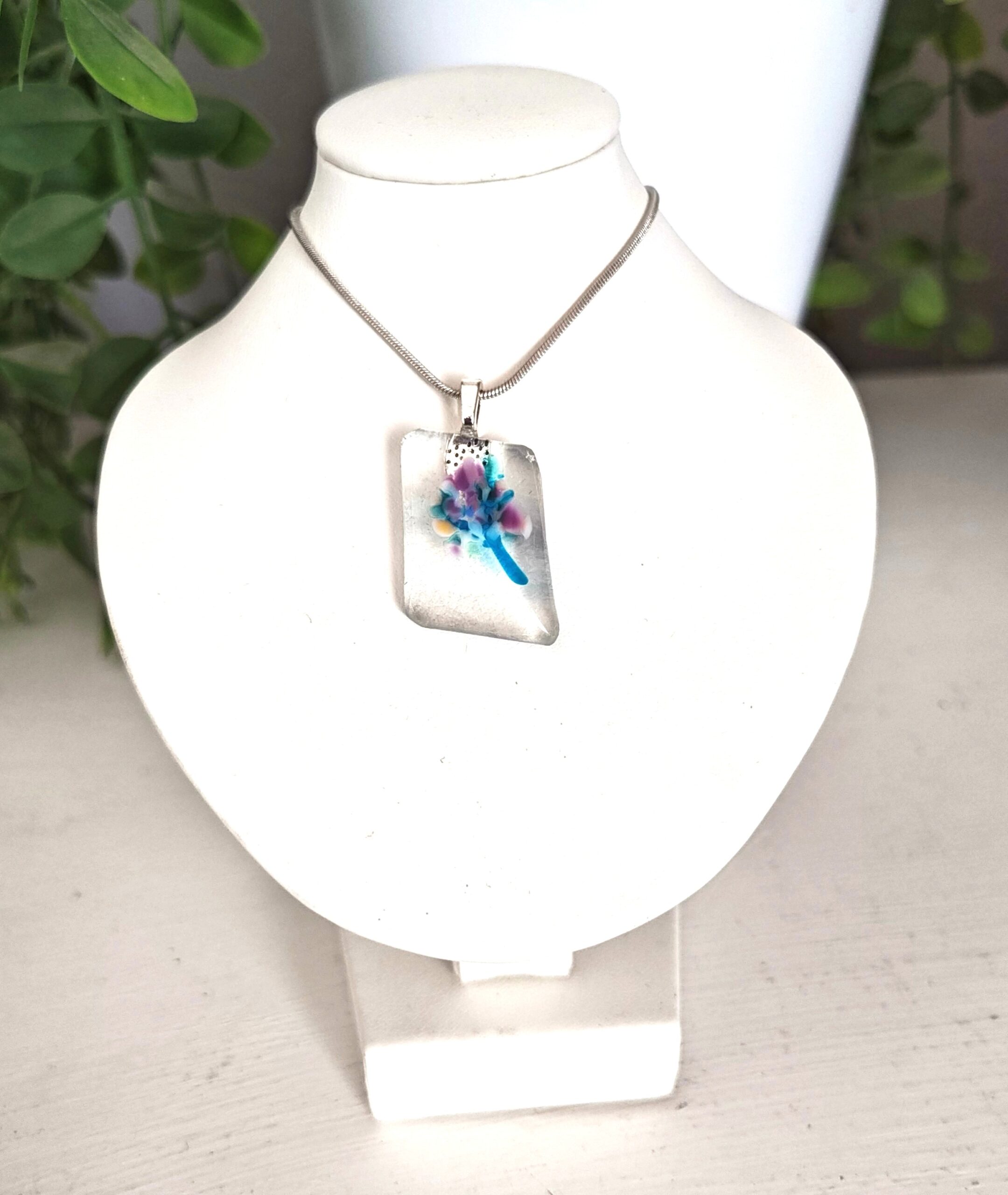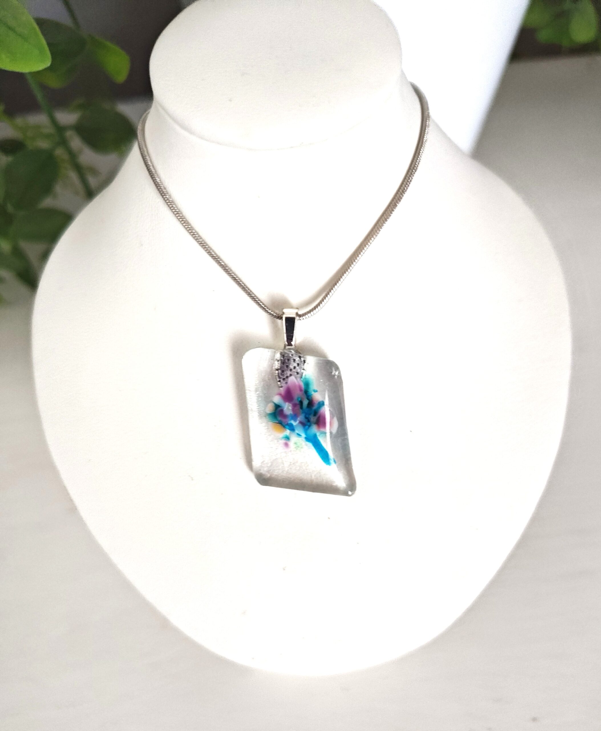 You receive this one of a kind handmade fused glass pendant and a silver colored snake chain.