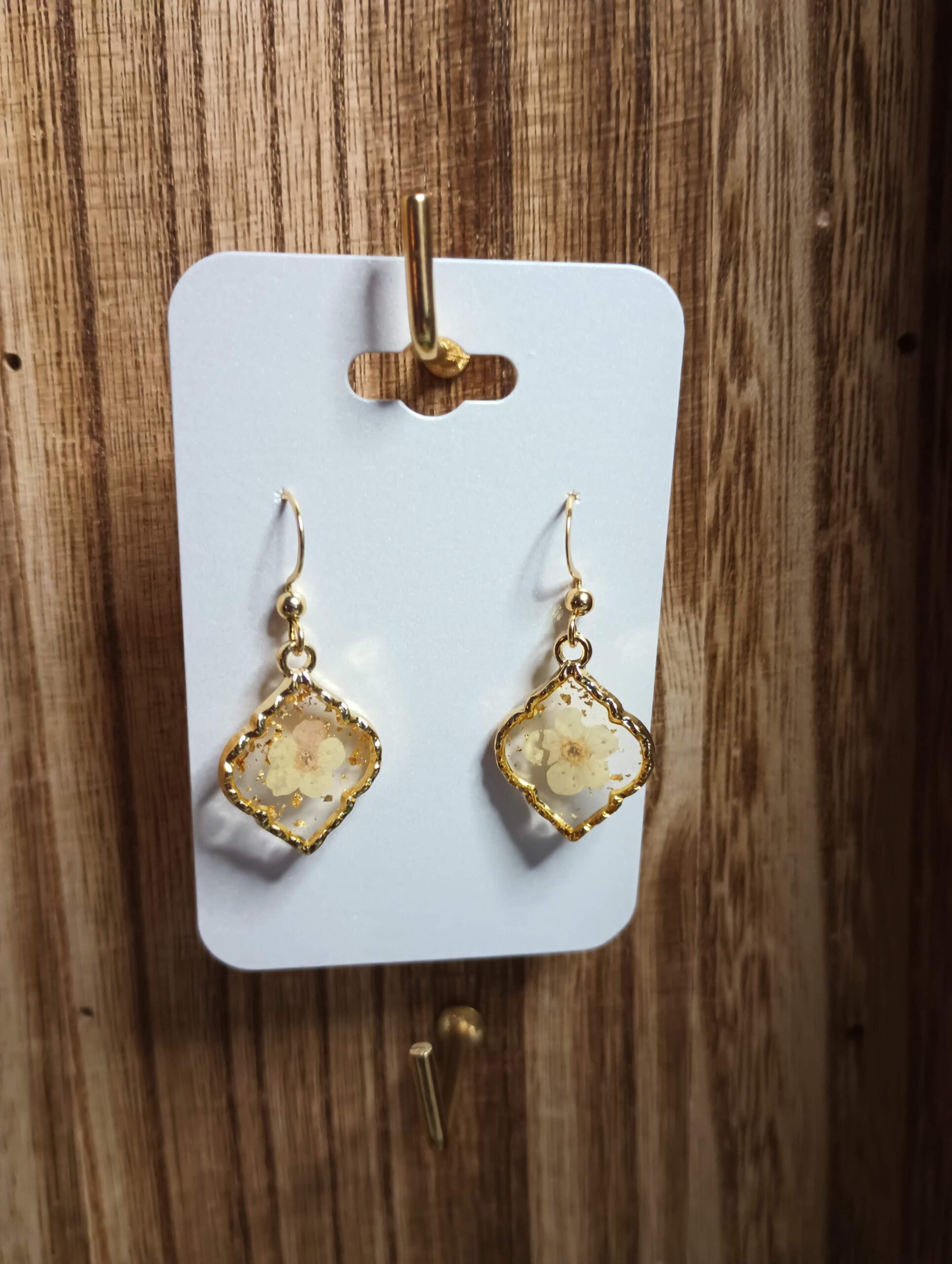 White Dried Flower in Resin with Gold Trim Earrings