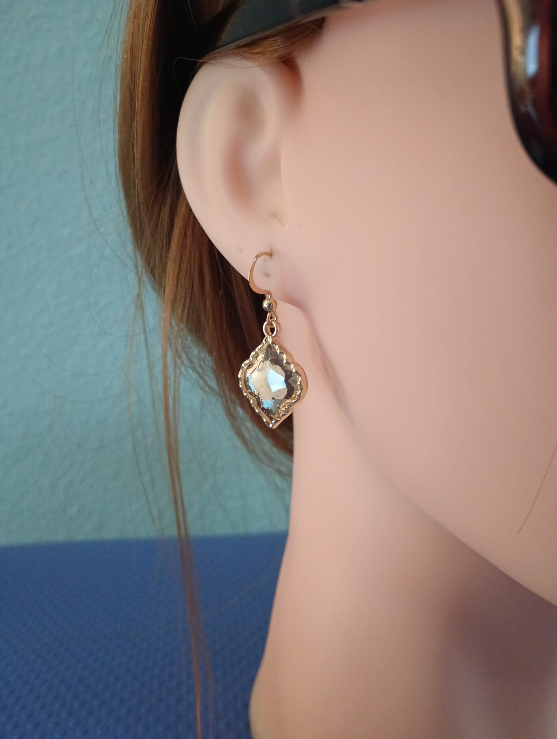 Delicate flower petals are suspended in resin and surrounded by textured gold tone metal. Wire hooks are gold plated. Earrings are small, just a little over 1/2″ drop. Note: Mannequin head is life size to show accurate size & drop of the earrings.