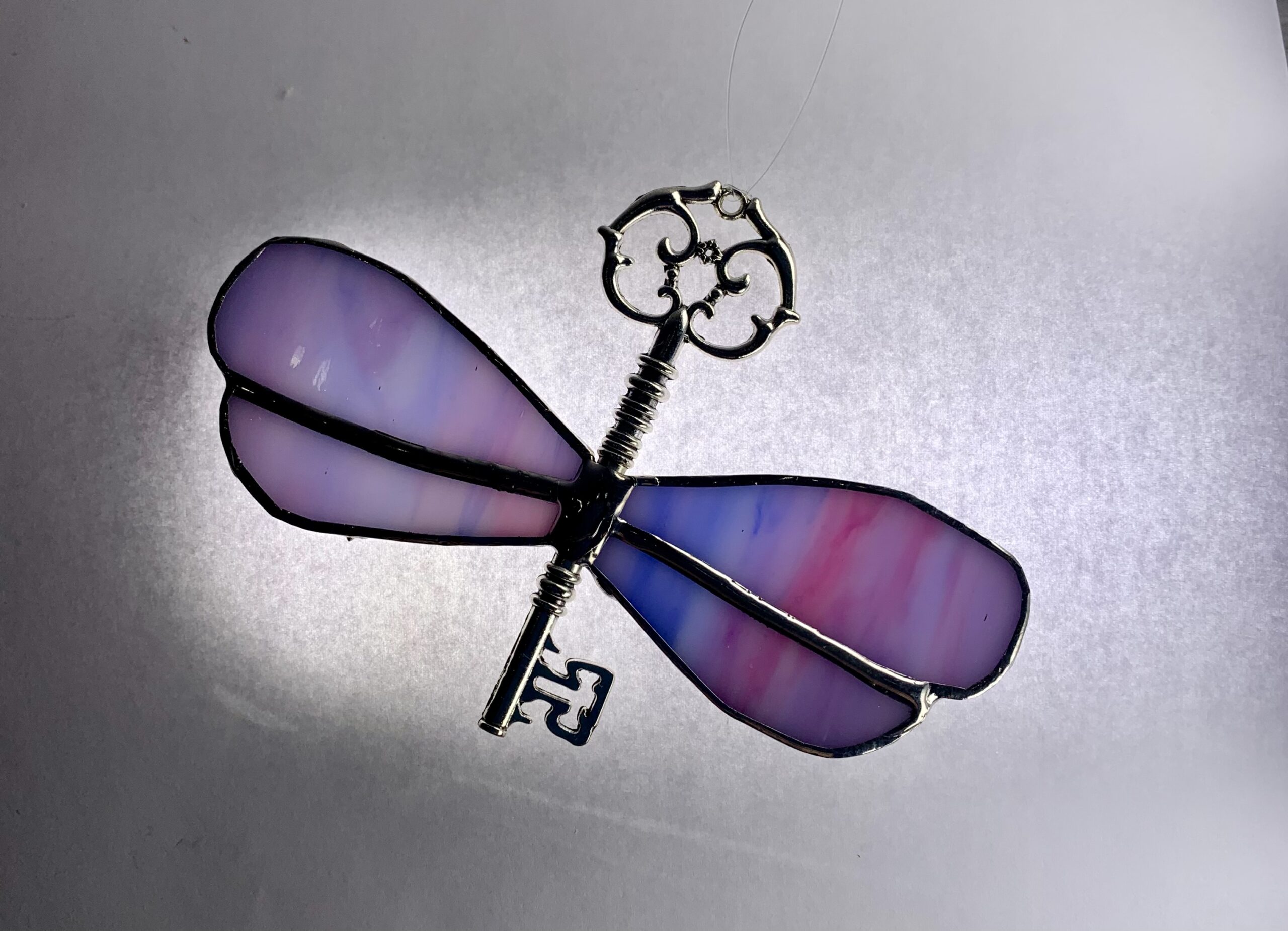 This unique stained glass Dragonfly key is made from an multi shades of purple/blue/pink semi opaque stained glass. Add this one of a kind flying key to your home or office!