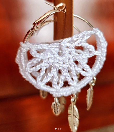 Crocheted hoop earrings in a dreamcatcher design with feather charms.