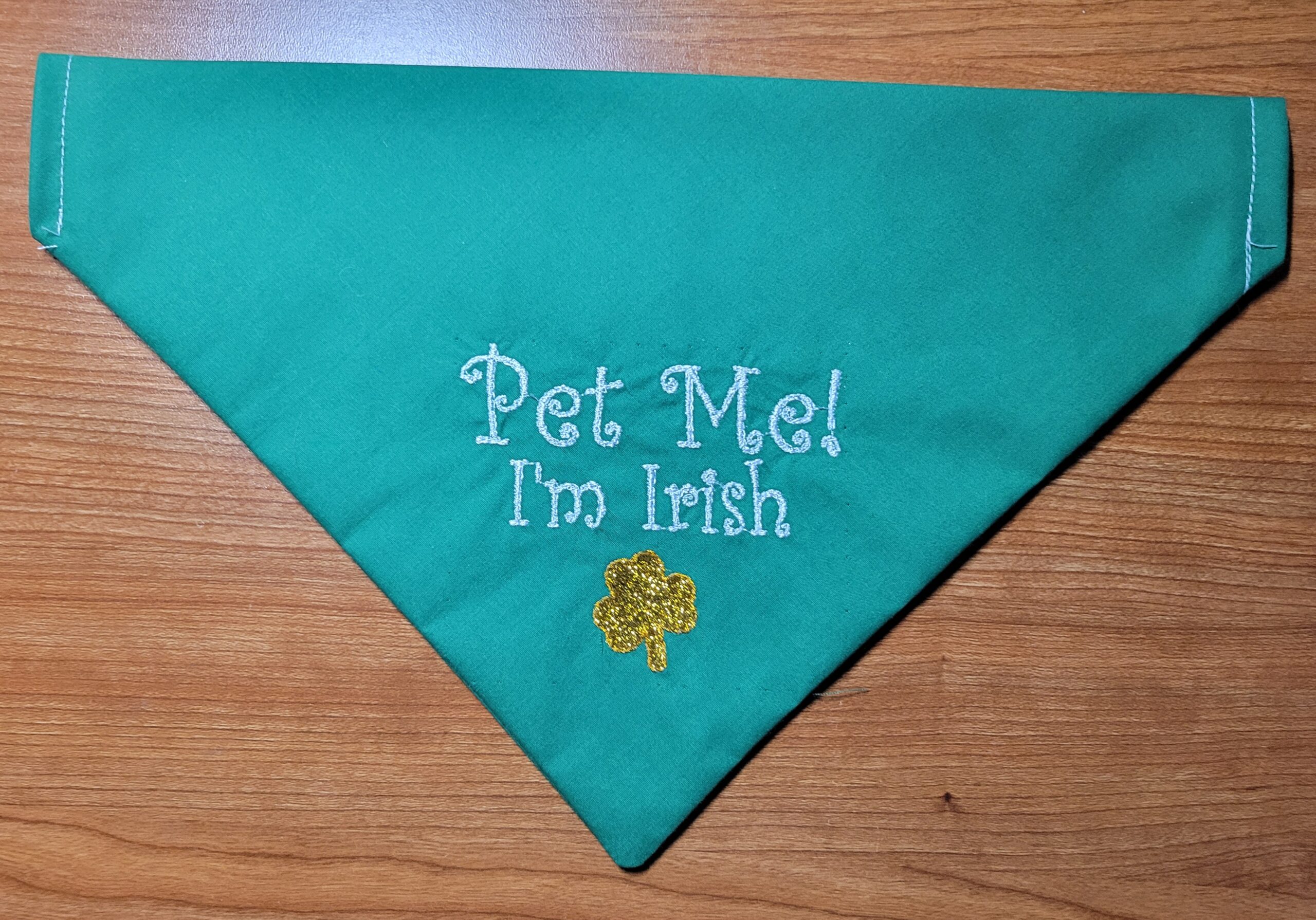 Looking for a St. Patrick’s Day dog bandana that’s festive, high-quality, and secure? This embroidered “Pet Me, I’m Irish” pet bandana is handmade from soft cotton fabric and designed for comfort and durability.
