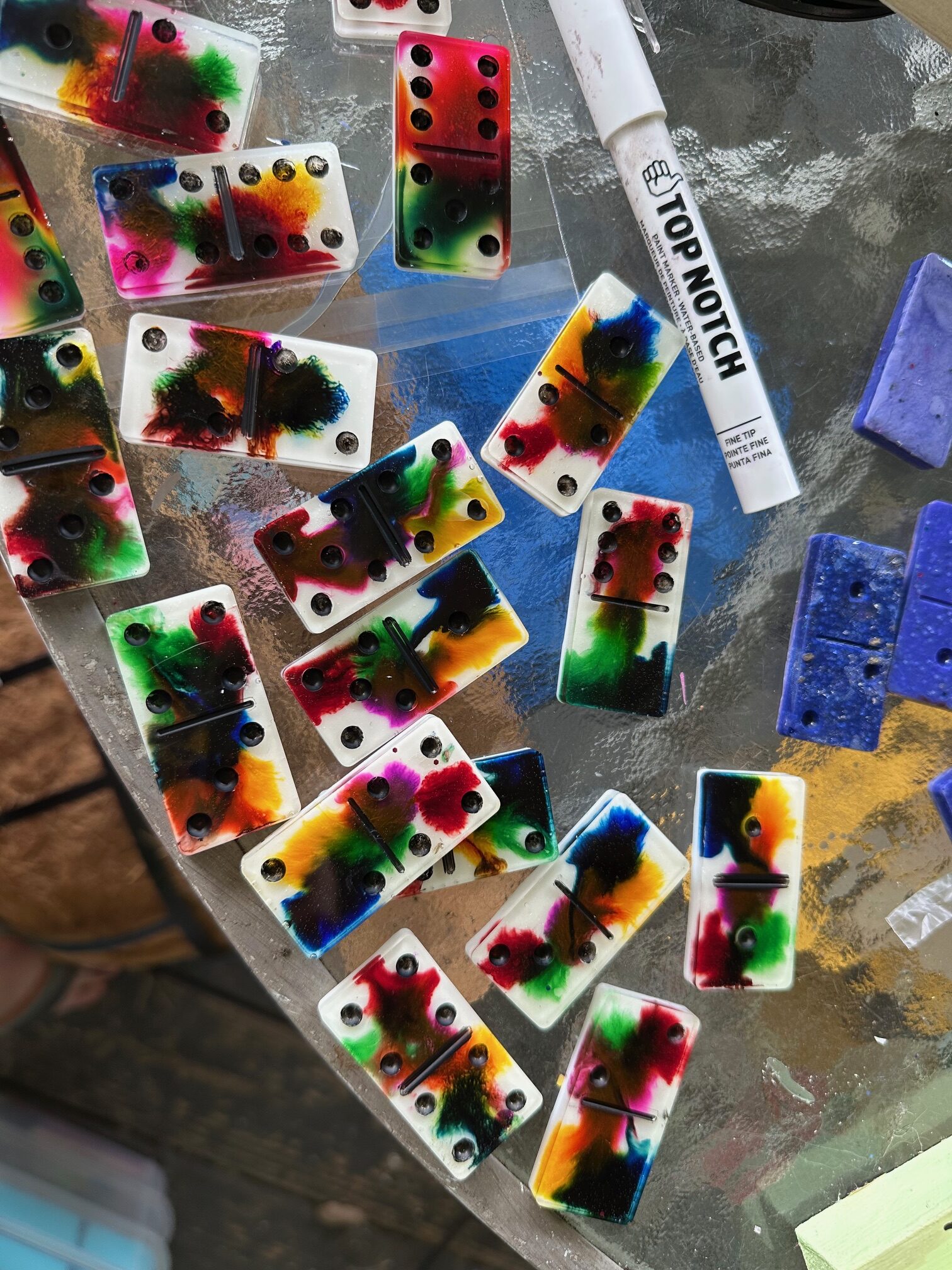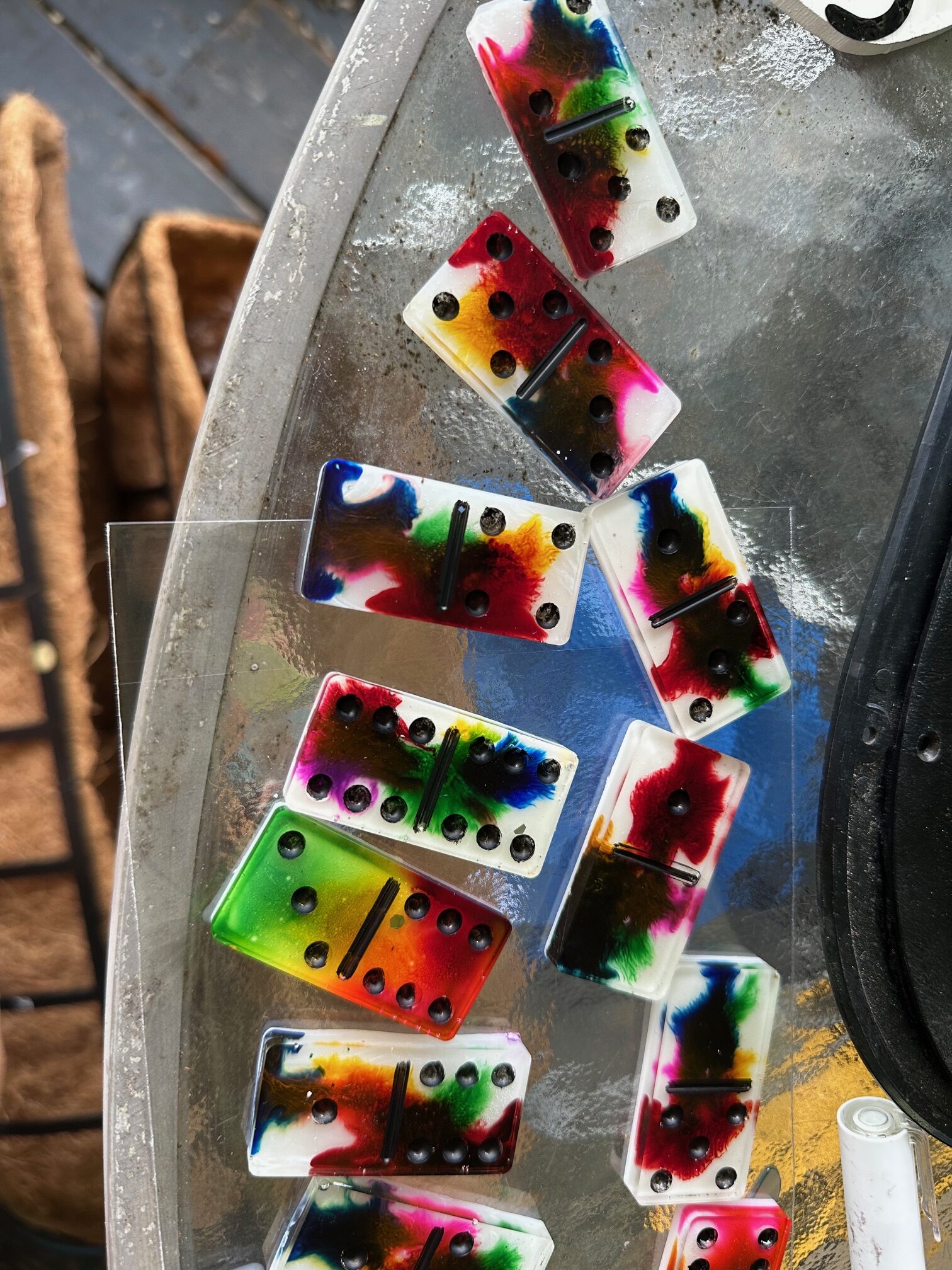 I have about 6 sets of handmade dominoes ready to go from white to pink and color splat. If you would like a specific color or design, please message if not, you will be sent one of the ones I have ready to go. These are handmade from resin, and the dots are all painted in.